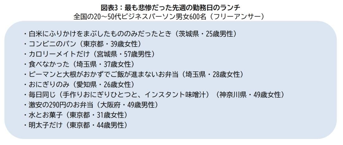 ・勤務日で最も悲惨だったランチを聞いたところ、「水とお菓子」「明太子だけ」と栄養バランスが悪い食事をとっている人がいることが浮き彫りになった。