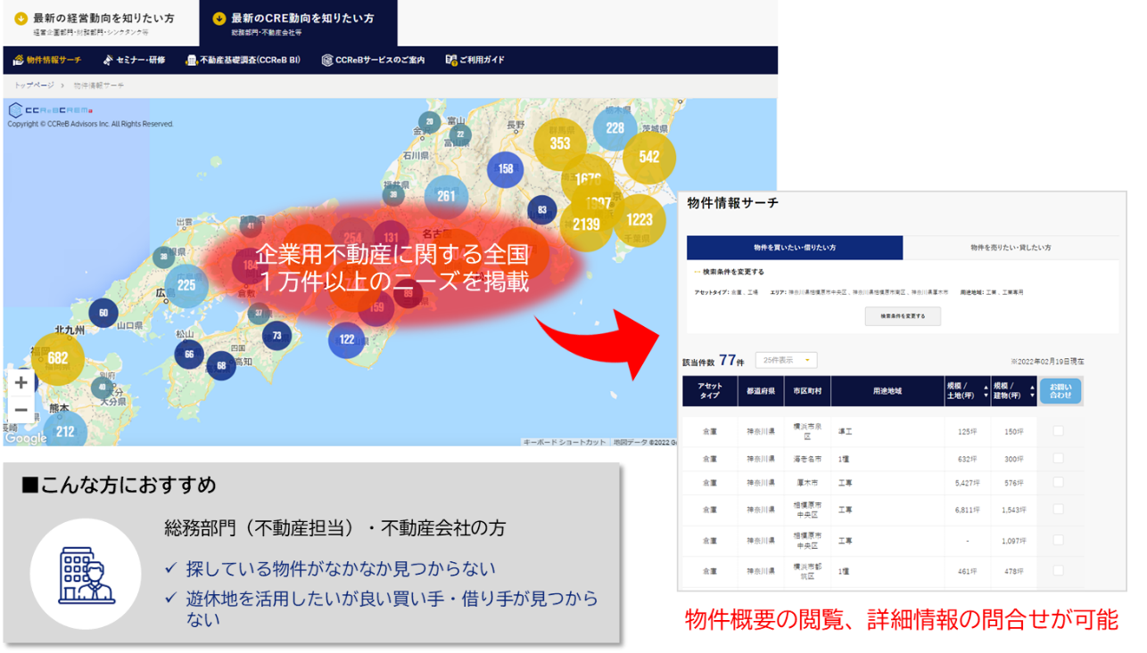 当社が提供する企業用不動産マッチングシステム“CCReB CREMa”に蓄積した企業の不動産ニーズをバブルマップで表示。エリア毎の売買・賃貸借ニーズを把握するとともに、詳細情報の問い合わせも可能です。