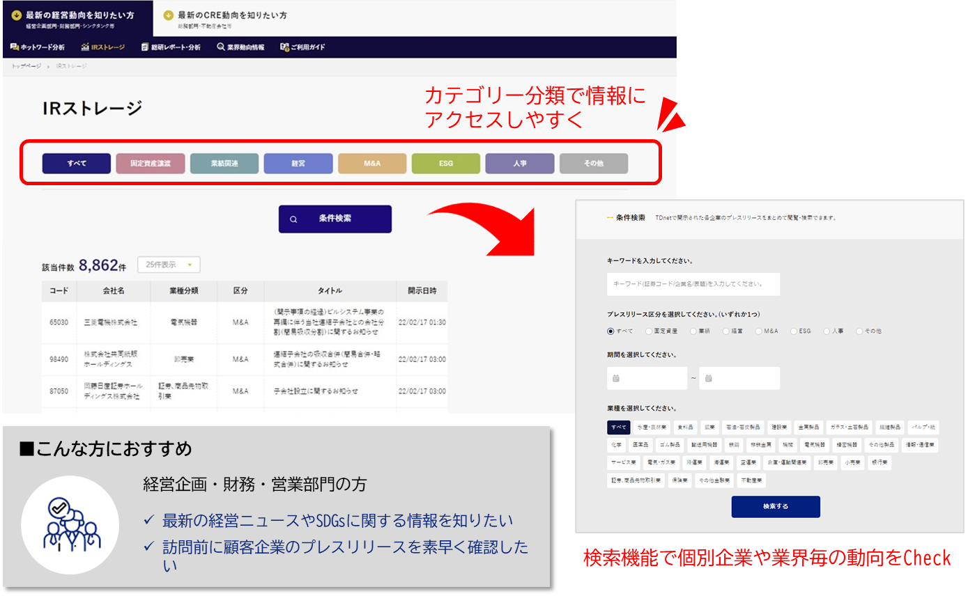 東京証券取引所が提供するTDnet APIとの接続により、上場企業による日々の適時開示をカテゴリー分類。知りたい分野の情報に瞬時にアクセス可能となります。