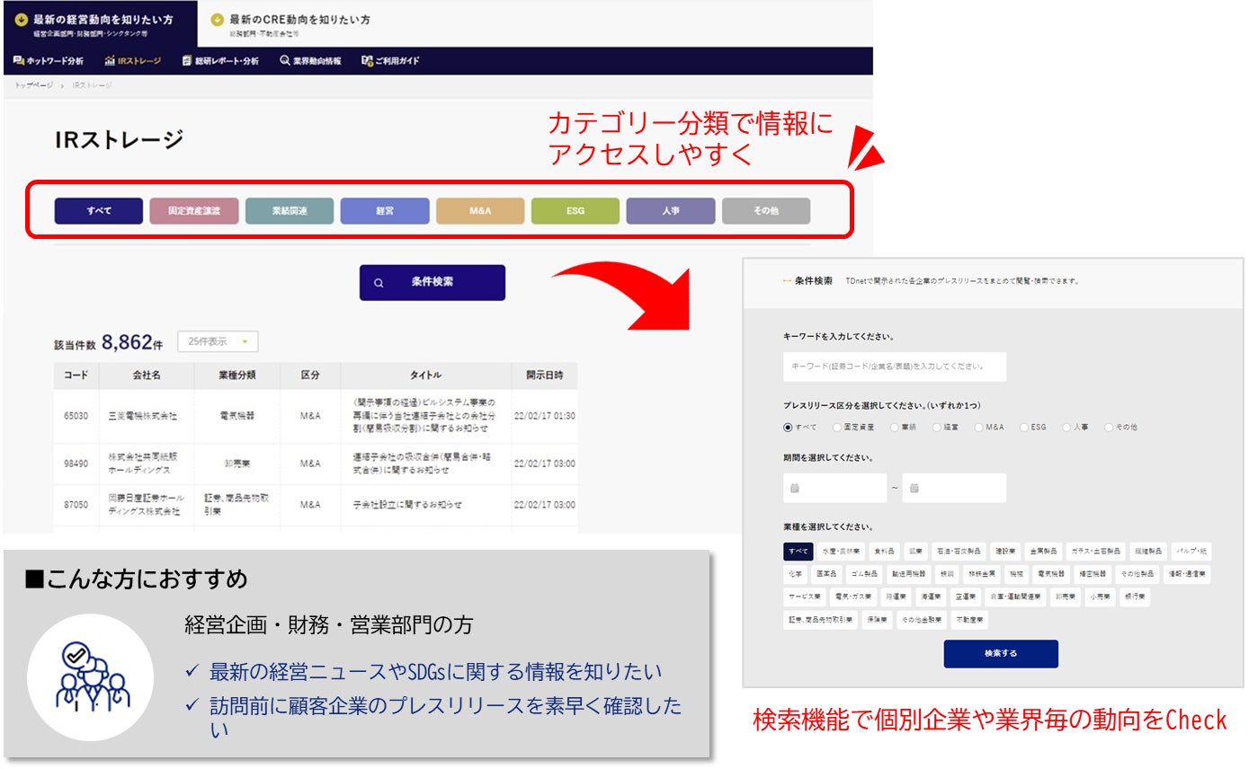 当社ではこれまで、不動産テック事業の中心となる法人営業支援ツール“CCReB AI”を通じて、中期経営計画書や有価証券報告書等を解析し、企業の不動産戦略(CRE戦略)を分析する仕組みを不動産業界に対して提供して参りましたが、企業の開示書類から経営動向を読み解くニーズは不動産業界以外からも度々問い合わせを受けてきました。経済環境が著しく変化する中、世の中のニーズの高まりを受けて、当社に蓄積する膨大なデータとその解析エンジンをより幅広い業界で活用できる仕組みとして開発し直し、あらゆるビジネスパーソンがアクセスできるポータルサイトとしてこの度リリースすることに至りました。