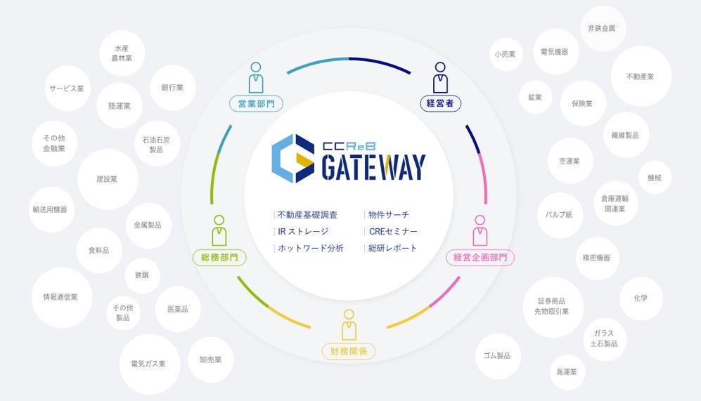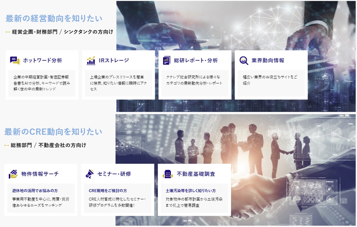 ククレブグループ及びククレブグループの提携企業が展開するテックシステムを連携し、企業の最新の経営トレンドや企業経営に必要となる情報を発信する、これまでにない新しい形のB2B向けポータルサイトです。提供するコンテンツは、企業の開示資料等から経営動向を読み解くコンテンツと、近年重要性が増す企業不動産(CRE)戦略に関するコンテンツの2つに分類され、前者は経営者、経営企画・財務部門等の経営戦略に関わるビジネスパーソンに、後者は総務部門、不動産会社等の企業不動産を扱うビジネスパーソンに特に活用頂ける内容となっています。CCReB GATEWAYにはどなたでもアクセス可能ですが、会員登録(登録無料※)頂くことで各コンテンツをより便利にご利用頂くことが可能です。