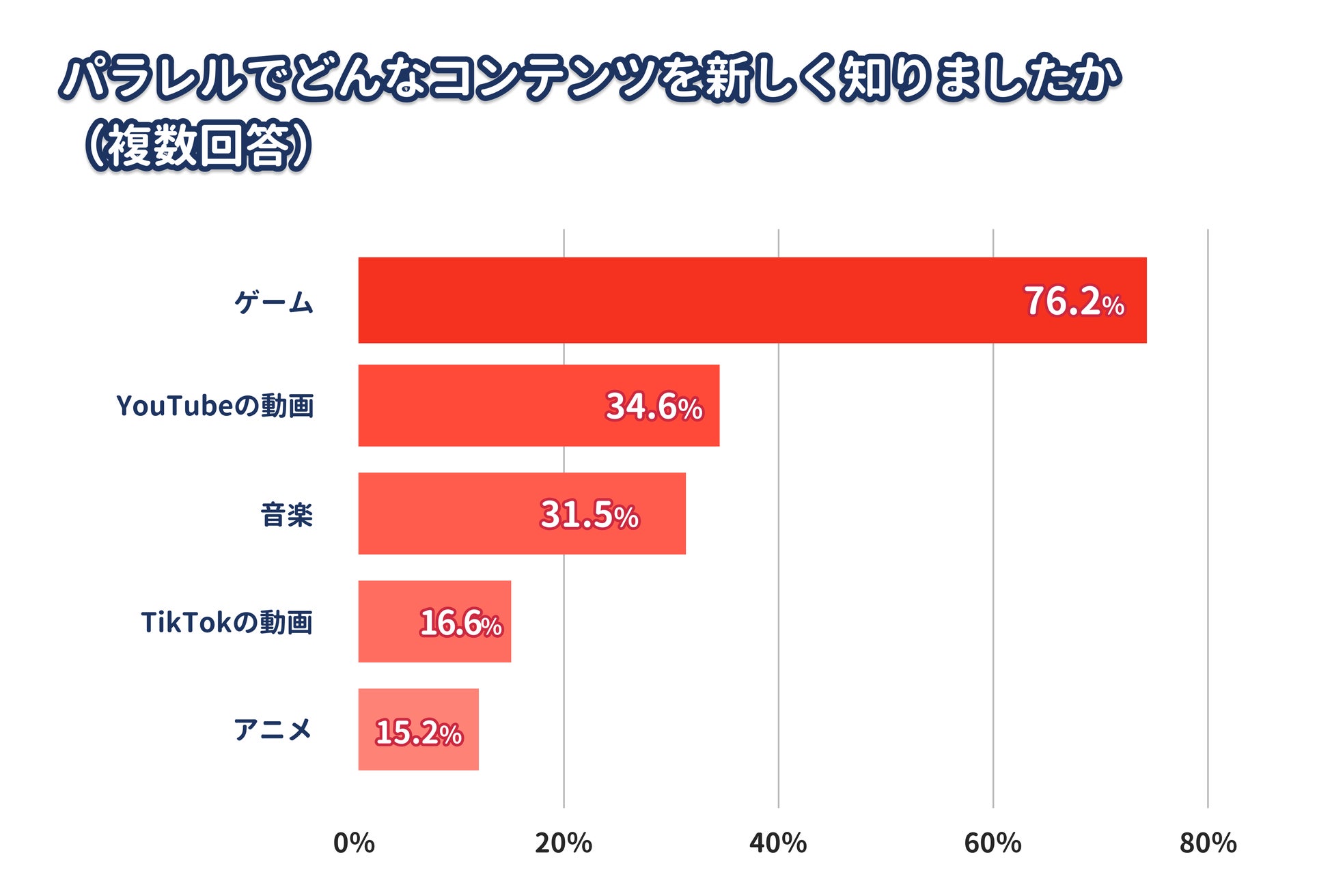 また、パラレルで新しく知ったコンテンツ1位はゲーム(76.2%)、2位はYouTubeの動画(34.6%)、3位は音楽(31.5%)となり、幅広いコンテンツの認知が形成される場になっています。