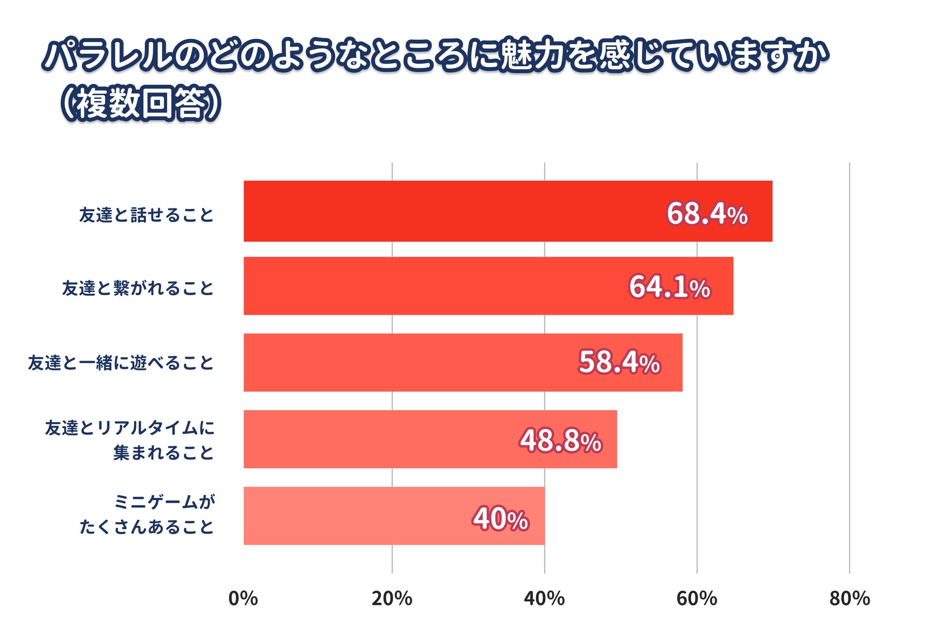 パラレルの魅力について聞いたところ、1位「友達と話せること」(68.4%)、2位「友達と繋がれること」(64.1%)、3位「友達と一緒に遊べること」(58.4%)となりました。