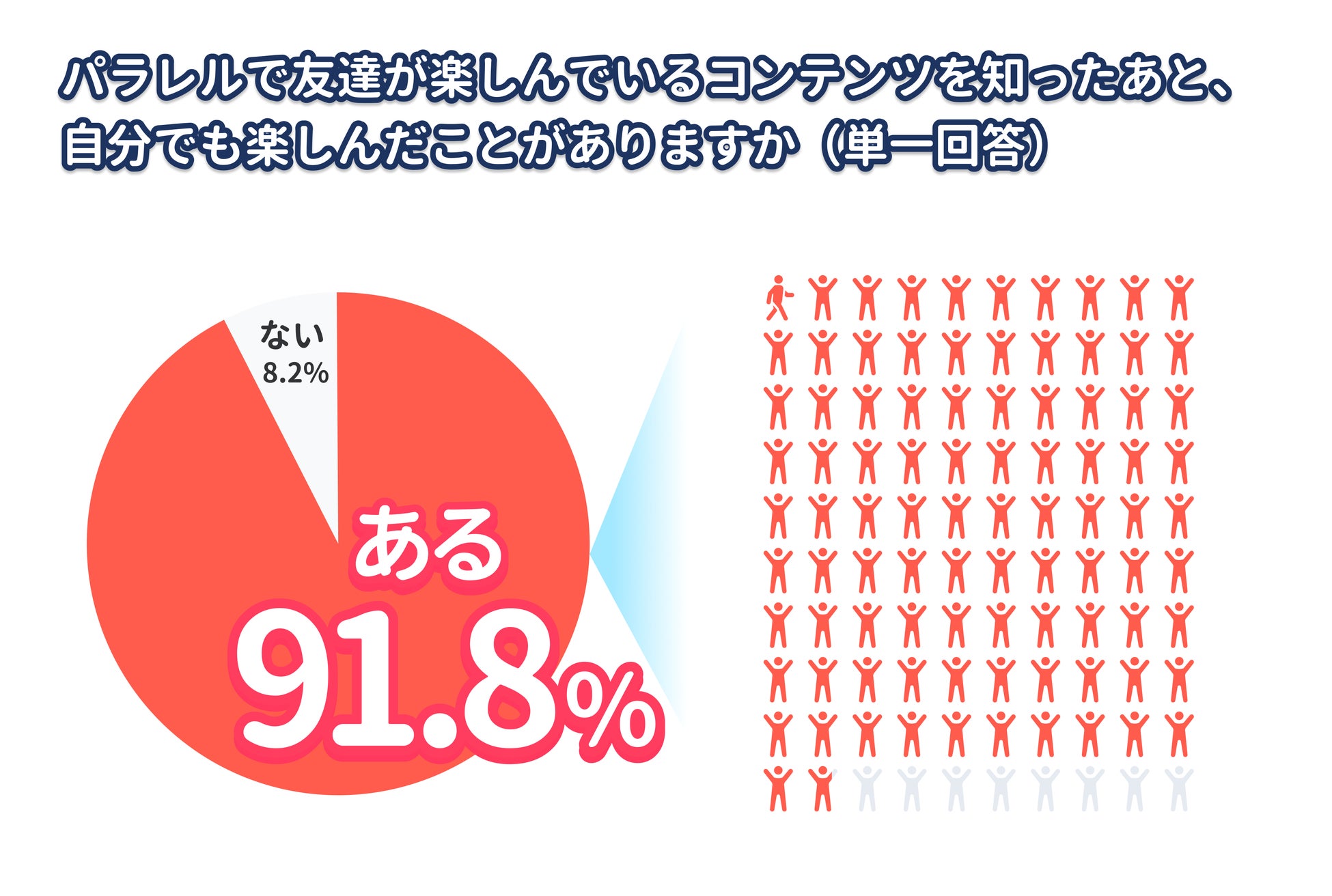 さらに「パラレルで友達が楽しんでいるコンテンツ(ゲーム、音楽、動画など)を知ったあと、そのコンテンツを自分自身でも楽しんだことがある」と回答したユーザーは約92%に達しました。