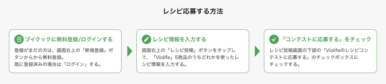 レシピ投稿画面の下部の「Violifeのレシピコンテストに応募する」のチェックボックスにチェックする。