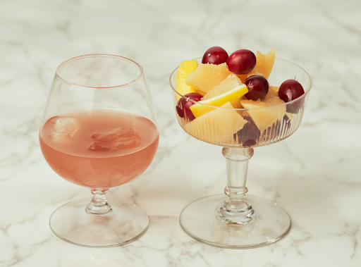 桃のカクテルと、専用のペアグラスセット。桃のカクテル片手にちびちびと楽しみながら、ゆったりと時間を楽しめるよう、あえて小ぶりなワイングラスをご用意しました。