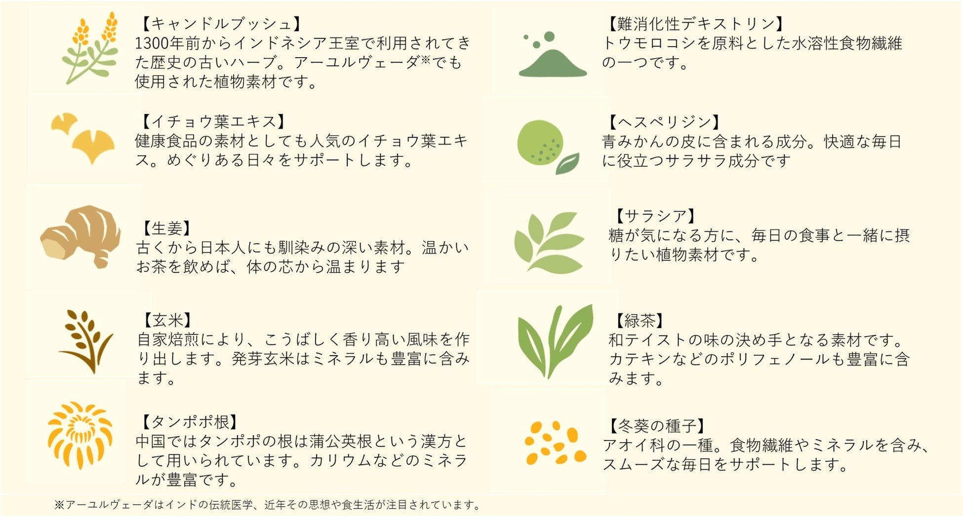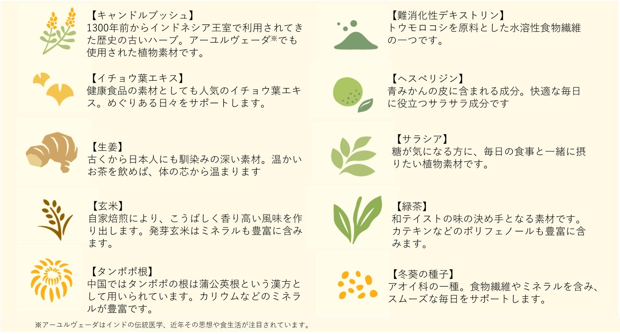 シニア男性にも気にいってもらえるように和テイストのお茶に仕上げました。自家焙煎にこだわった玄米を使用し、生姜、イチョウ葉エキス、ヘスペリジンといっためぐり素材も配合。馴染みのある玄米茶味はどんな食事にもよくあいます。社内アンケートでも1番人気を獲得した味なのでシニア男性以外にもおススメです。