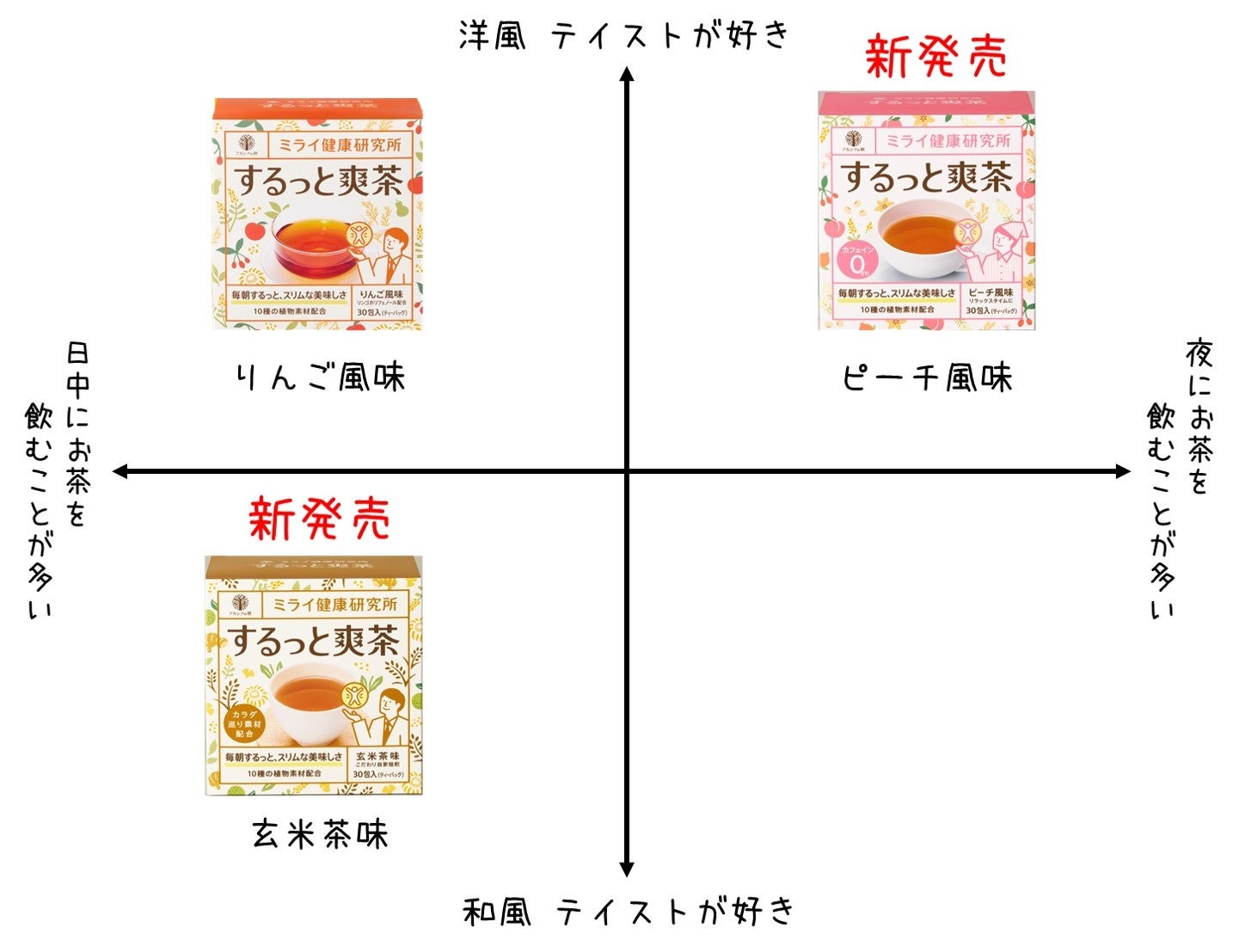 するっと爽茶リンゴ味を販売後、数多くのお客様からお喜びのお声をいただいておりました。その中にするっと爽茶を夜のティータイムに活用していますというお声がありました。このお声を参考にして、夜に飲んでいただくことを想定し開発したのがピーチ風味です。