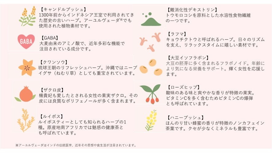 茶葉はカフェインゼロにこだわりルイボスやハニーブッシュを使用。夜に飲むシーンを想定し、カフェインレスの茶葉を使用。リラックスタイムに嬉しいGABA、ラフマ、クワンソウを配合しました。さらに女性に人気の大豆イソフラボン、ザクロ外皮なども配合し、やさしいピーチフレーバーで仕上げました。もちろん日中に飲んでもOKです。(眠くなる成分は配合していません)