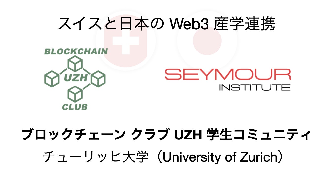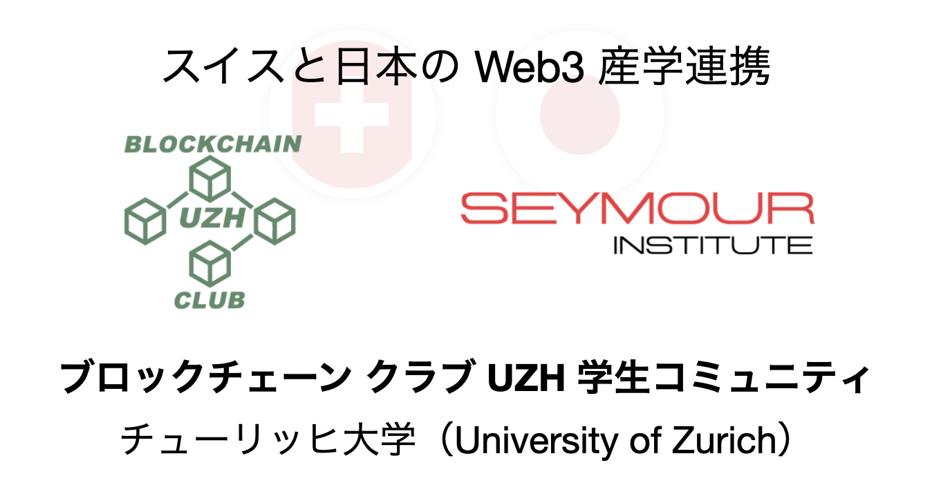 スイスと日本のテクノロジーにおける産学連携活動を行う アカデミック シンクタンク SEYMOUR INSTITUTE 株式会社(本社:東京都渋谷区広尾、代表:太田真)は、チューリッヒ大学 (UZH) の学生コミュニティ「ブロックチェーン クラブ UZH」(本部:チューリッヒ大学内、設立者:Kiril Mitrov)と提携し、日本の企業または学生たちがスイスの学生コミュニティとWeb3に関する学術研究に取り組める機会を創出します。