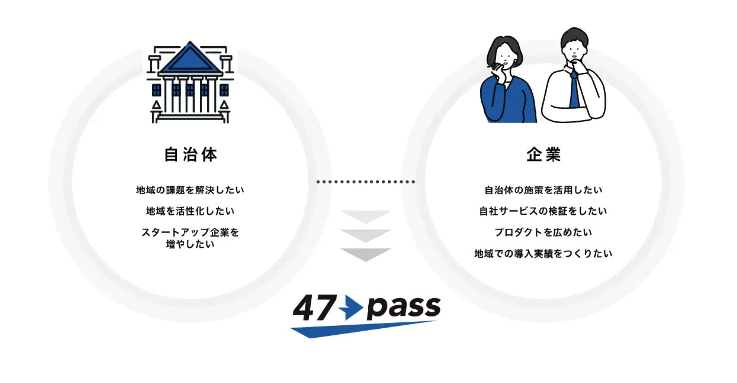 そこで弊社は、自治体施策の実証実験に着目し、企業のサービスやプロダクトを地方をはじめとする日本全国への拡大を支援する「47pass(よんななパス)」を開発いたしました。