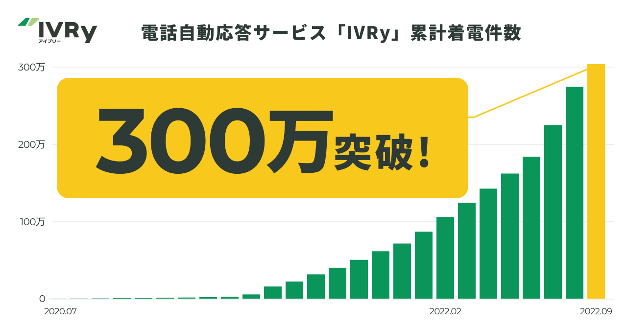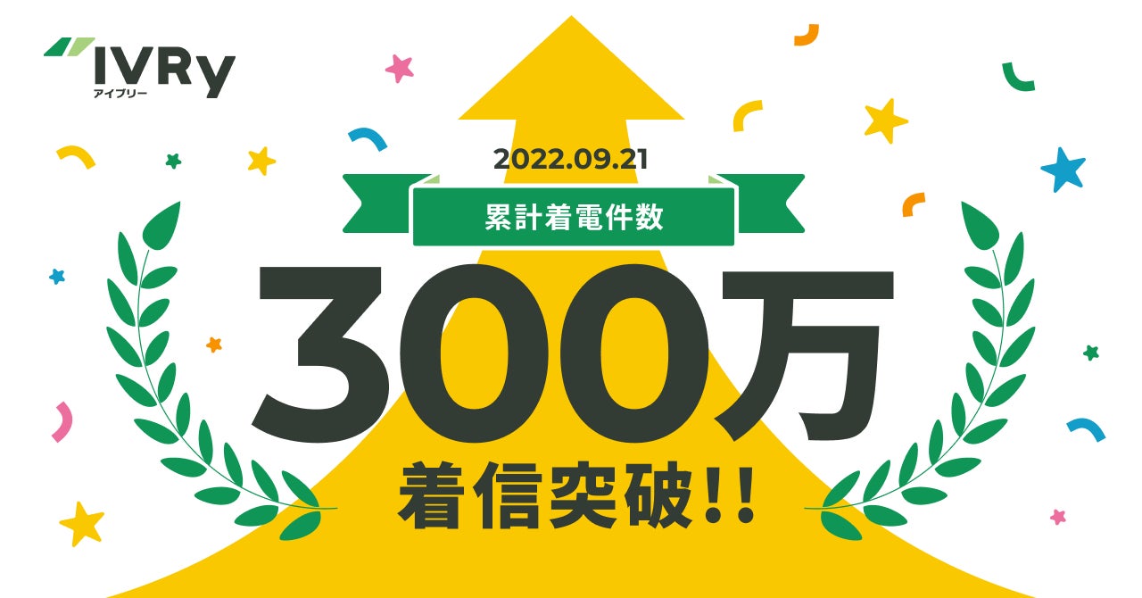 株式会社IVRy(本社:東京都台東区、代表取締役CEO:奥西 亮賀、以下「当社」)は、当社が提供する電話自動応答サービス「IVRy(アイブリー)」において、累計着電数300万件を突破したことをお知らせいたします。(2022年9月21日時点)