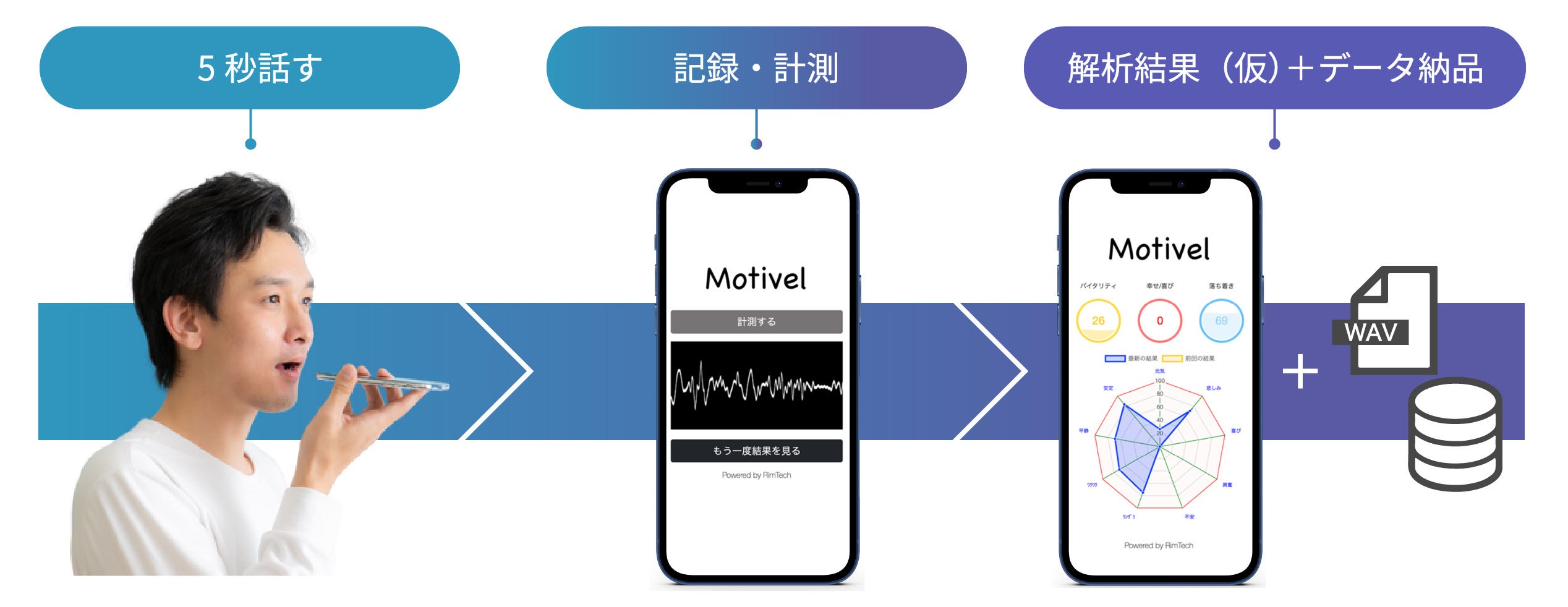 インターネットに接続したデバイスを使用して発話音声データを収集します。収集するタイミングは、「出勤時」「仮眠前」「退勤時」となります。発話音声データの収集にはRimTechが開発した専用のWebアプリケーションを使用し、収集の都度、AI音声解析エンジンMotivelで解析し、感情やモチベーションの状態が即時に分かります。