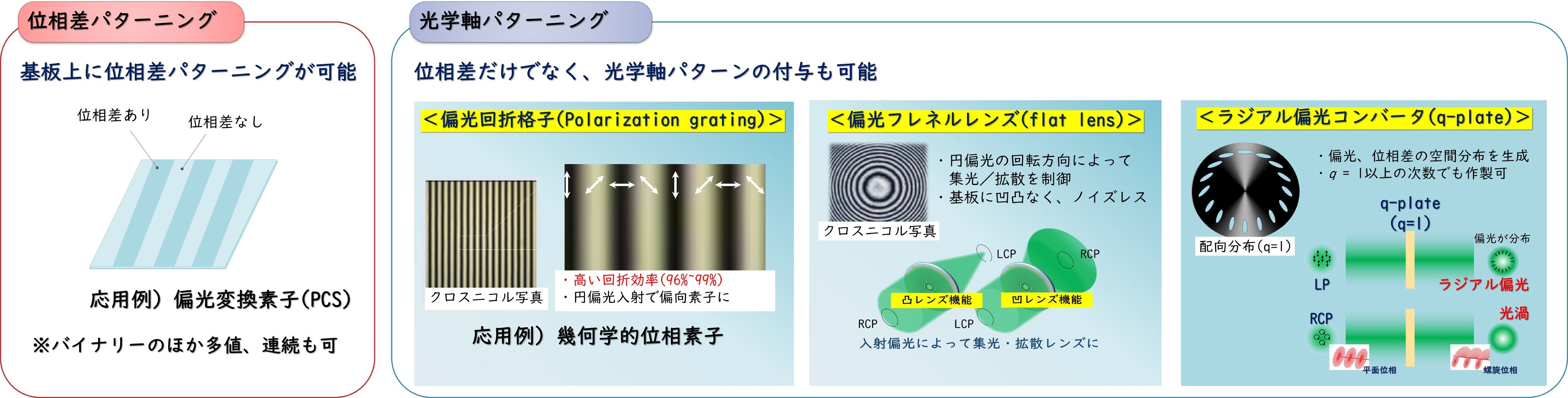 ※3 次世代光学素子とは・・・位相差を任意に制御できる技術を生かして、従来にはない配向パターンを実現します。この技術は将来的に、撮像やセンサ、光通信などの分野で応用が期待されています。