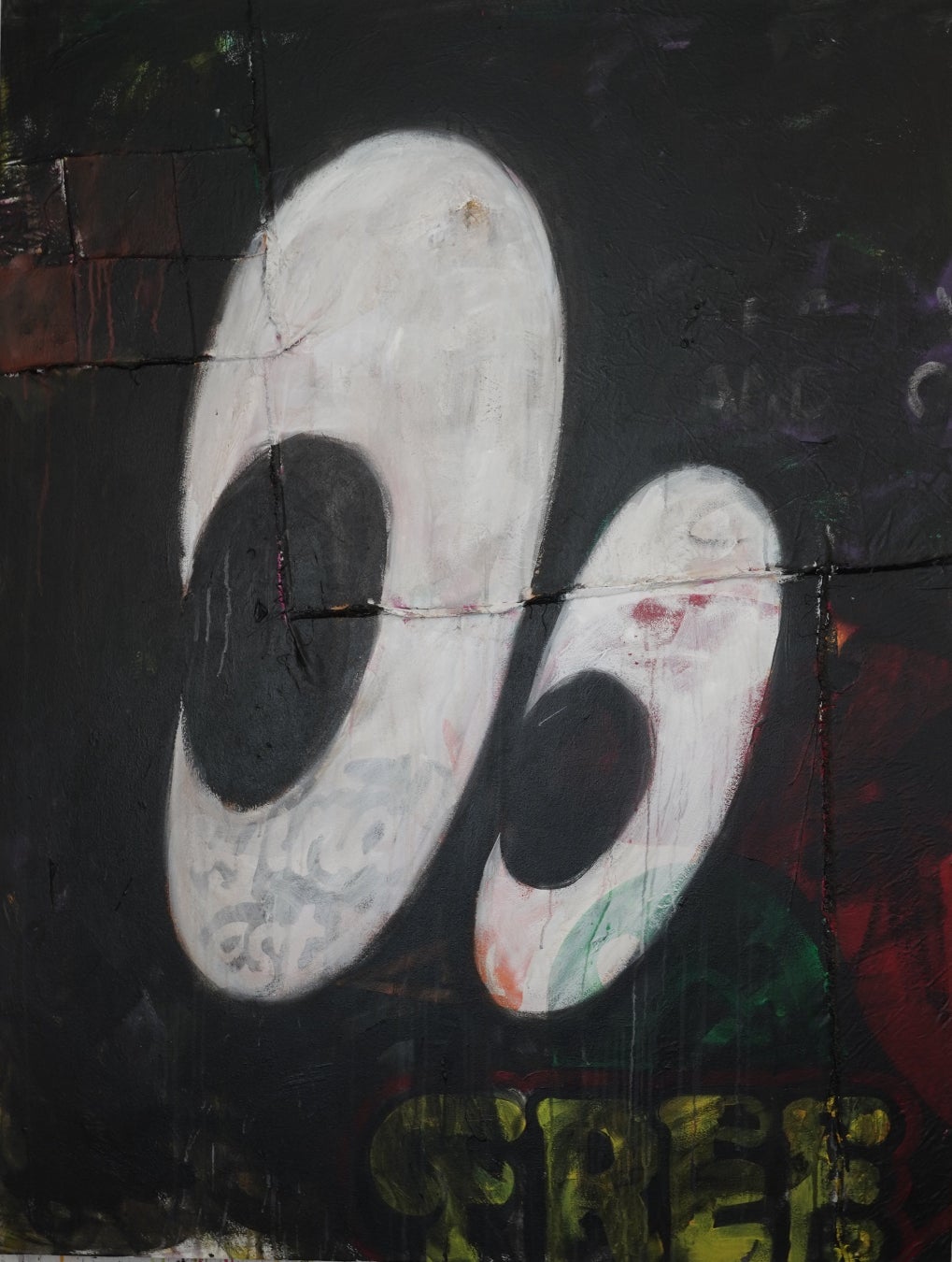 代表的なシリーズ「暗闇の中で光る目玉」のモチーフには、幼少期から他人の視線にさらされることに恐怖感を抱いていたKINJOの身体感覚が発端となっています。しかし、その作品群は「見る側」と「見られる側」という二項対立によって分断された現代社会の構造をも可視化していることに気づかされます。