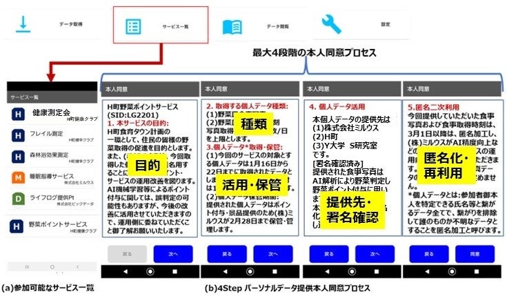 これまではサービス提供者やサービス毎にアプリが用意されスマホ画面上に雑多なアプリが溢れる恐れがありましたが、本アプリを起動すれば信頼できる複数の企業や機関の多様なサービスから、自身のデータを提供しても良い提供先やサービスを選択し、サービスの目的、保管/消去条件、匿名再利用可否等の提供したデータの活用条件を確認したうえで本人同意をして初めてデータが提供されます。貴重なパーソナルデータを個人のスマホに分散して暗号保管し、必要な時に必要な活用先に提供されるので、最近多発している情報流出のリスクを局所化できます。活用側も提供されたデータの署名を確認することにより、真正性(本人が提供した改竄の無いデータであることの証明)を確認でき、安心してデータを活用する事が出来ます。世界の潮流となりつつある、本人主導のデータ活用であるパーソナルデータストア(PDS)の概念を忠実に実現していますので、世界的にも厳しいといわれる欧州一般データ保護規則(GDPR)に沿ったサービスを提供できます。なお、本技術の基本特許は日米欧で取得済みです(※2)。 下図2は「貯健箱(R)」アプリのサービス都度本人同意のスマホ画面例です。読みずらい契約書ではなくステップバイステップで同意ボタンを押すことにより、高齢者でも納得したうえで信頼できる提供先にデータを提供できますので、なりすまし業者に誤って貴重なパーソナルデータを提供する事を抑止します。