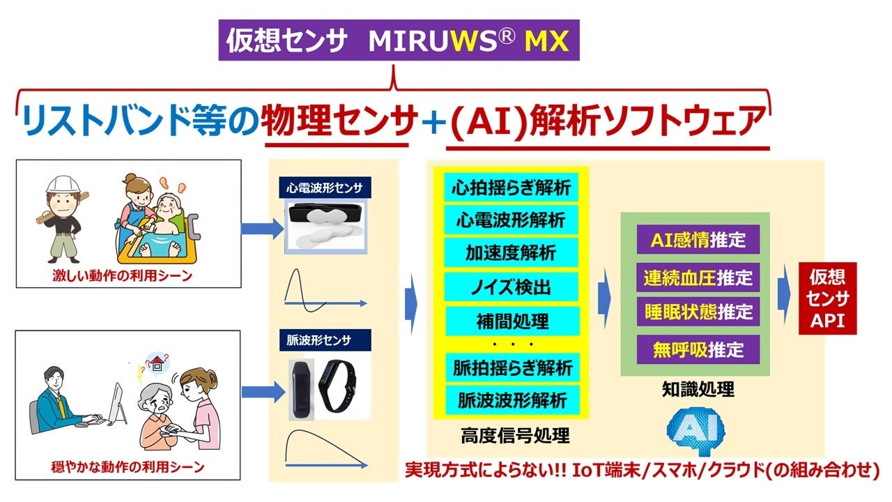 併せて、取得したバイタルデータ(「脈波波形」「加速度波形」等)から「感情」「連続血流圧」「睡眠効率」など、心身の状態を高精度で推定するソリューション(「仮想センサ MIRUWS(R) MX」)を提供し、フレイル(※1)の対策・予防へつなげていきます
