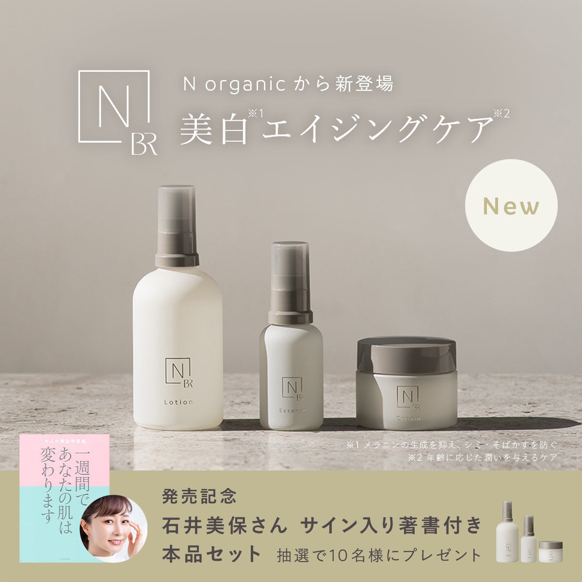 石井美保さんのサイン入り著書「一週間であなたの肌は変わります」とN organic Brightの化粧水・美容液・クリーム本品3点をセットにし、抽選で10名様にプレゼントします。この機会に、キャンペーンへのご応募をお待ちしております。応募方法など、キャンペーンの詳細は以下サイト内よりご確認下さい。