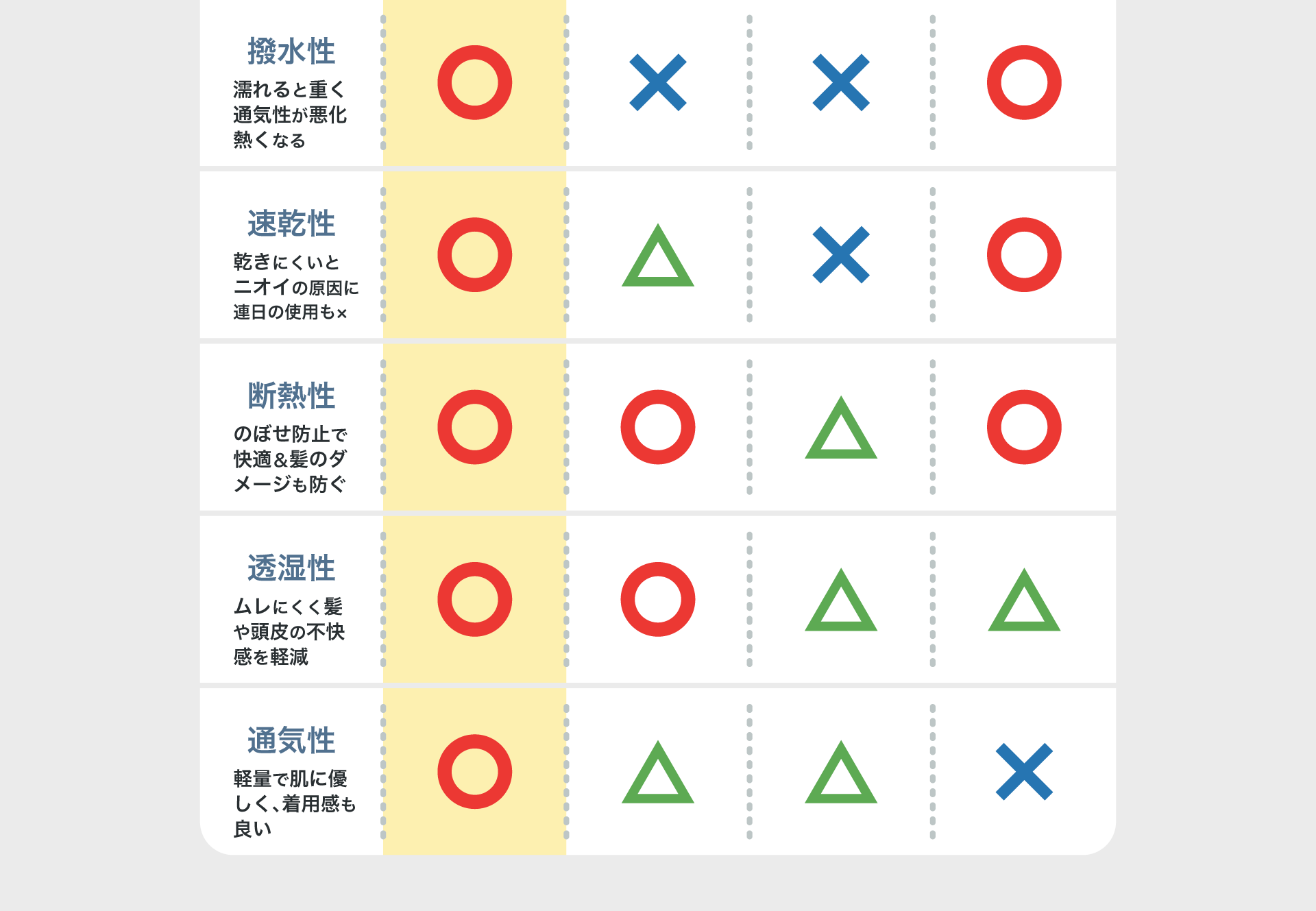 「H2OFF®︎」と、独自の3層構造「軽量3Dメッシュ」を組み合わせることで断熱性を確保。のぼせ防止、髪や頭皮の負担を軽減します。
