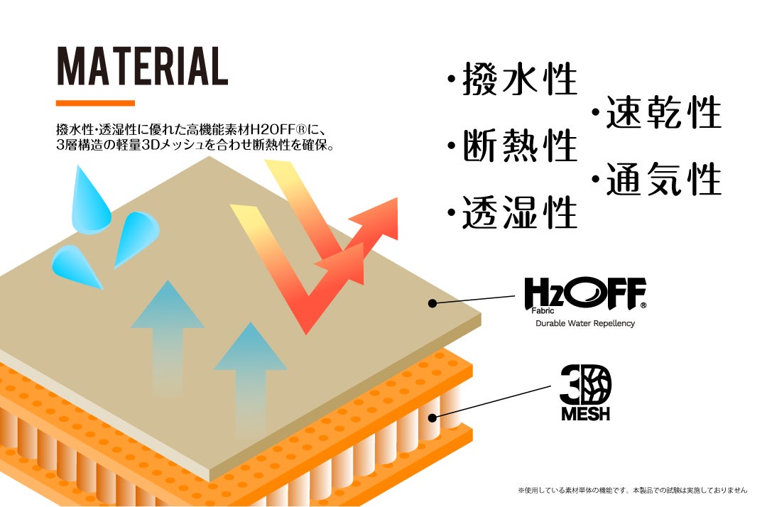 素材の追求:撥水性に優れた高機能素材と軽量3Dメッシュを合わせ断熱性を確保。