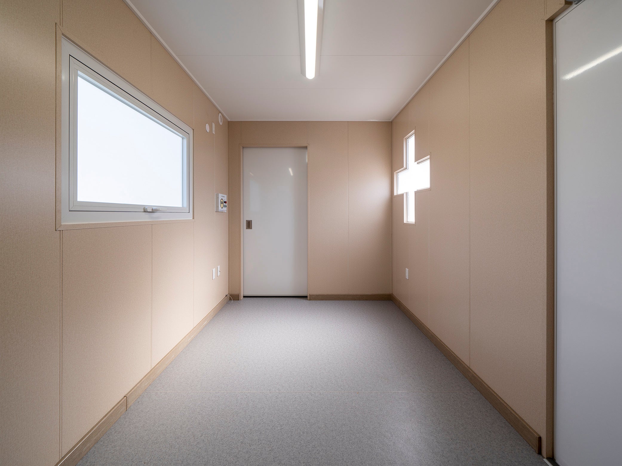 「モバイルクリニック™」は、医療従事者の 感染リスクを最小限まで減らすことを目的に設計された、移動型診療所です。日本の建築基準法 に合致した建築用コンテナに、感染症拡大防止の陰圧設備(米国疾病対策予防センター基準を大幅にクリア)を内蔵。台風などの悪天候にも耐えうる頑強さとモビリティ、医療用レベルでの感染症対策設備を併せ持つ、今までにない製品です。11 月 1 日現在、全国で 61 棟が発熱外来として稼働しています。