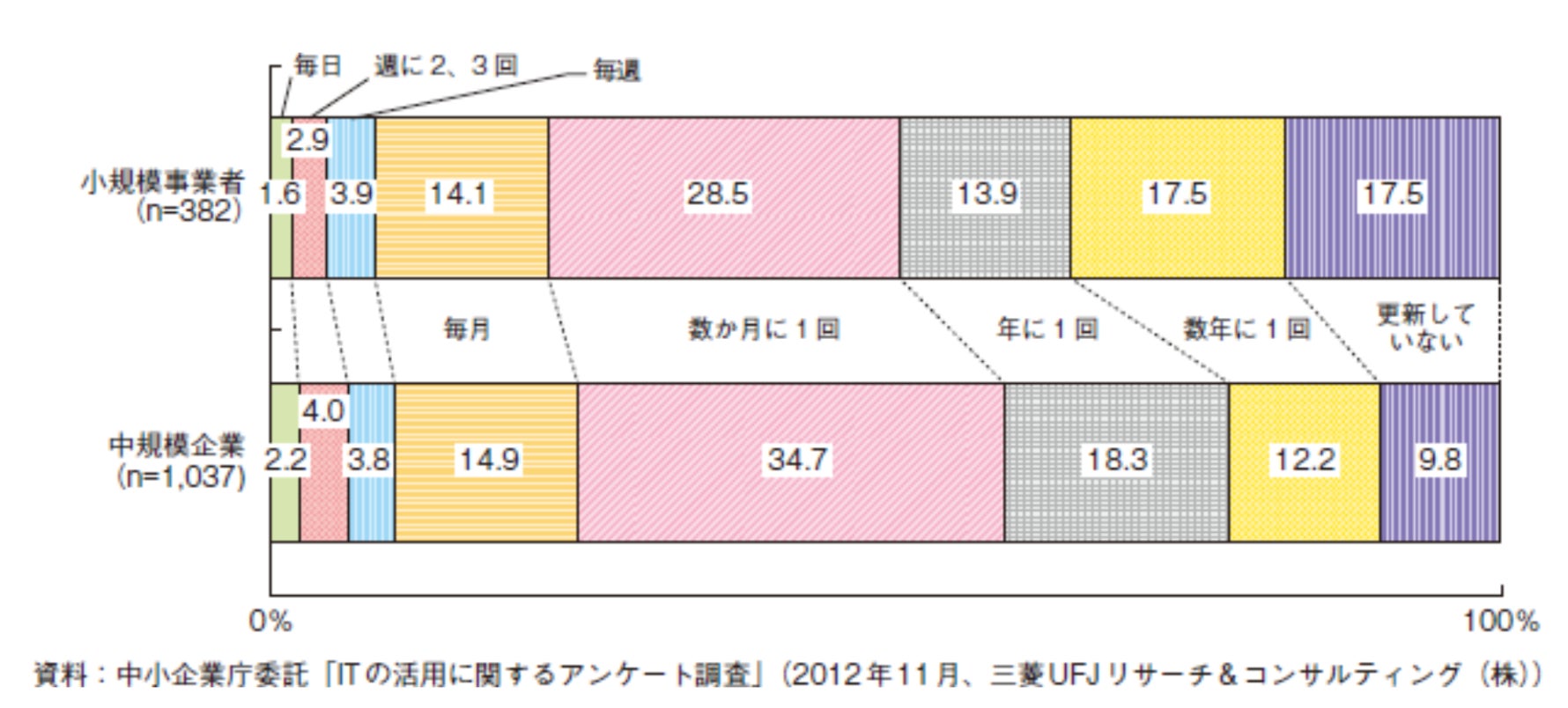 さらに深刻なのは、更新頻度です。同じ調査によると、ホームページの更新頻度は小規模企業で「更新していない」「数年に1回」「1年に1回」を合わせると、48.9%。中規模企業では40.3%となっています。つまり、中小零細企業では「ホームページはつくったものの、ほとんど更新していない」が半数近いということです。つまり、作ったは良いけれど、全くと言って良いほど機能していない中小零細企業が半数近いということなのです。