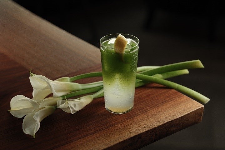 若葉から雨のしずくが滴り落ちる様子を表す、夏の季語「青時雨」をモチーフにした、抹茶と地元の柚子サイダーを使ったモクテルをご用意いたします。地元の柚子サイダーをベースに柚子のピューレ、濃茶で夏の爽やかさと時雨に煙る様をグラスの中に表現しました。