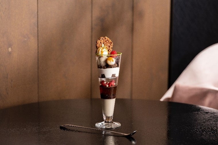 深みのある豊かな香りの加賀棒茶を使用し、和なテイストに仕上げたパフェ。パフェの中には、わらび餅や白玉、能登大納言を忍ばせ、様々な食感をお楽しみいただけます。加賀棒茶香るパンナコッタは濃厚でありながら、さっぱりした味わいに仕上げました。加賀棒茶ゼリーには山椒を使用し加賀棒茶と山椒の重なり合う香りをご堪能いただけます。棒茶のほのかな苦味と甘いチョコレートのバランスも絶妙です。ぜひこの機会に、風味豊かな和パフェをお楽しみください。