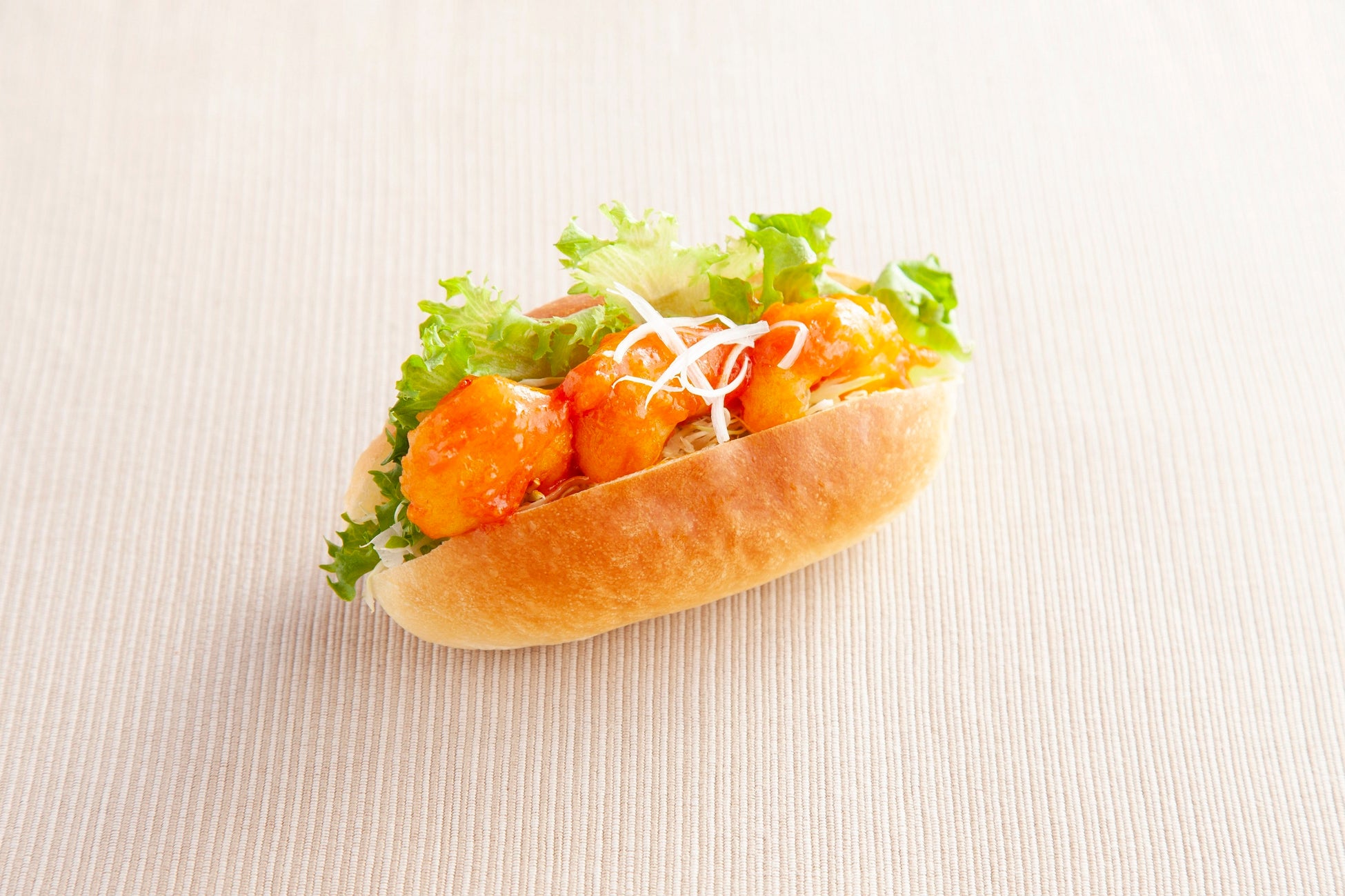 ぷりぷりの海老をたっぷりのキャベツと一緒にサンド。ふわふわコッペとエビチリの旨辛ソースがよく合います。