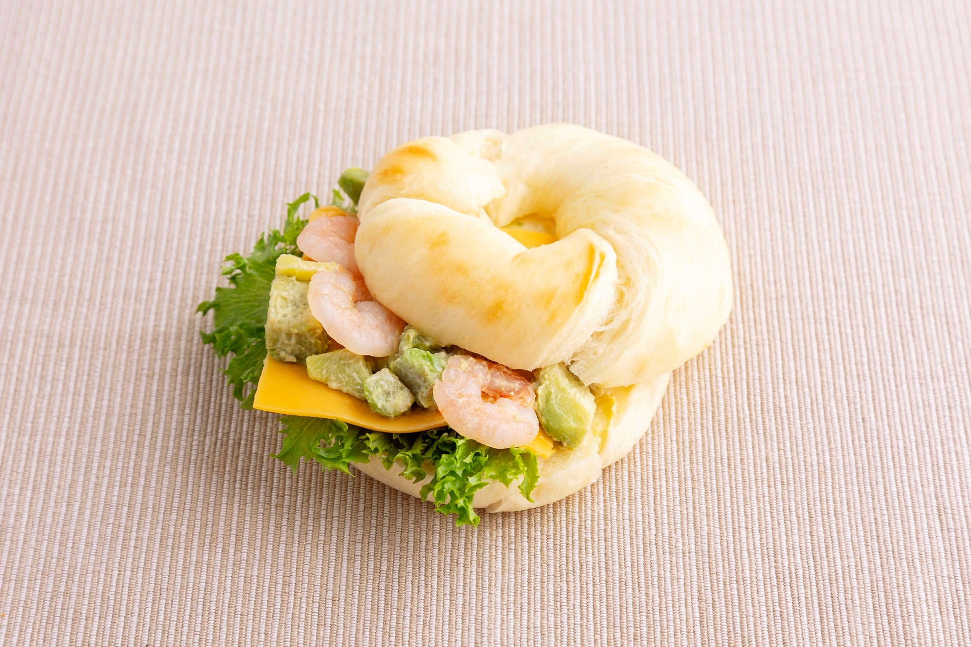 もちもちのベーグルにマヨネーズで和えたエビ・アボカドをチーズ・オニオンと一緒にサンドし、マイルドでおいしいヘルシーサンドに仕上げました。