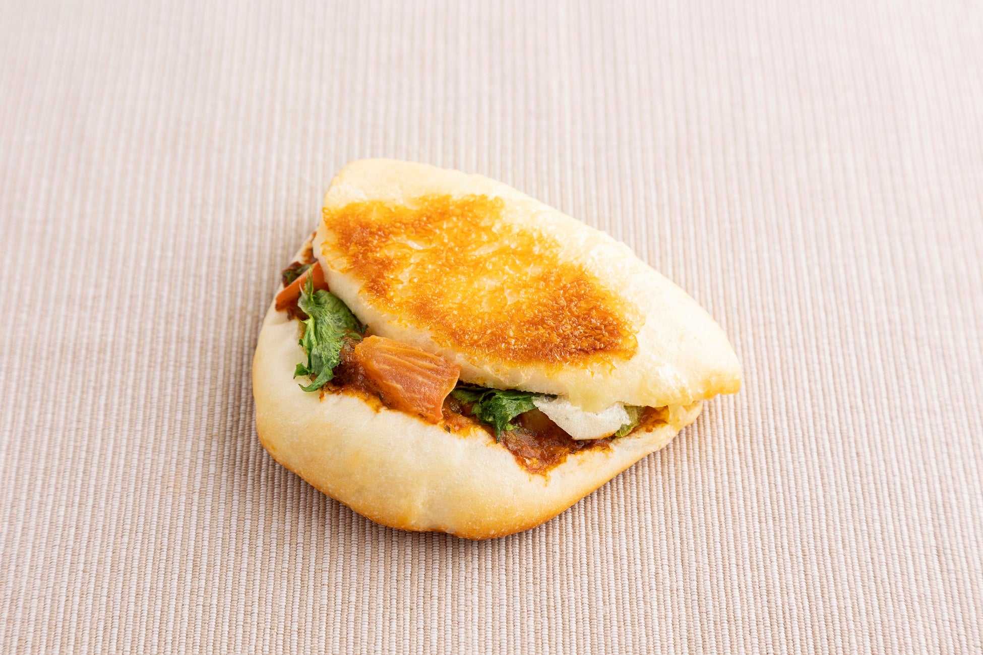 メキシコ料理の定番「タコスミート」をたっぷり挟んで焼き上げました。ピリ辛でスパイシーなタコスミート・レタス・トマトが、もちっとしたパンによく合います。