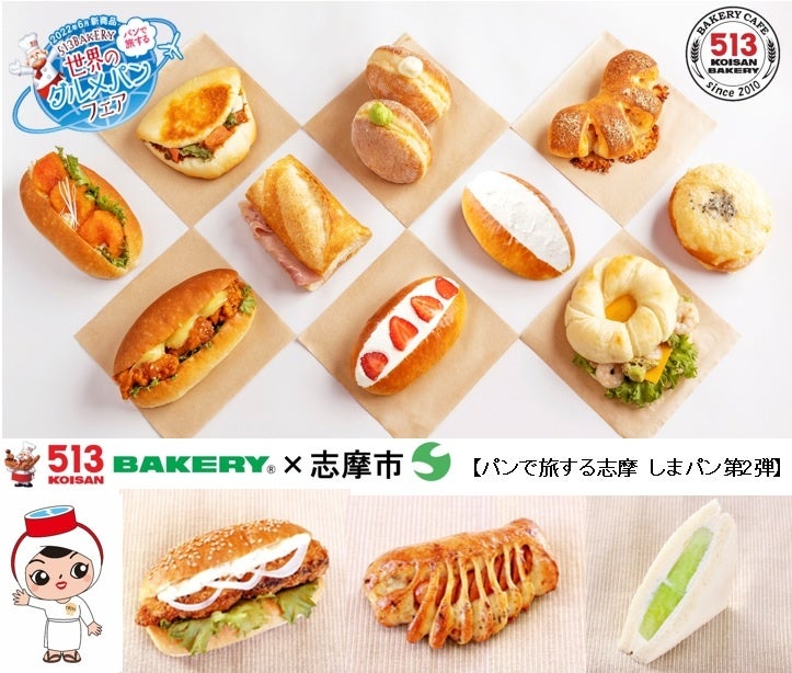三重県・愛知県で全11店舗を展開する513BAKERYは、2022年6月より、『パンで旅する!世界のグルメパンフェア』を開催。マリトッツォの次にくると言われ話題のイタリアの定番スイーツ「ボンボロー二」が、513BAKERYに初登場!ふわふわに揚げたパンの中にたっぷり詰められたクリームには、513BAKERY自家製のミルキーで濃厚な生クリームを使用。クリームたっぷりの新感覚生ドーナツをぜひお召し上がりください。そのほか、メキシコ料理の定番「タコスミート」を使ったパンや、ドイツ産のマイルドなチーズ「ステッペンチーズ」を使ったパンなど、世界の美味しいパン全12品を販売いたします。また、三重県志摩市の食材を使った『パンで旅する志摩 しまパン』シリーズに、6月から第2弾の商品が新登場!「夏のしまパン」となる第2弾では、「南張メロン」、「ゴマサバ」、「志摩あおさ豚ポークウインナー」を使用。ぜひ513BAKERYのパンで志摩市産の旬の食材をお召し上がりください。