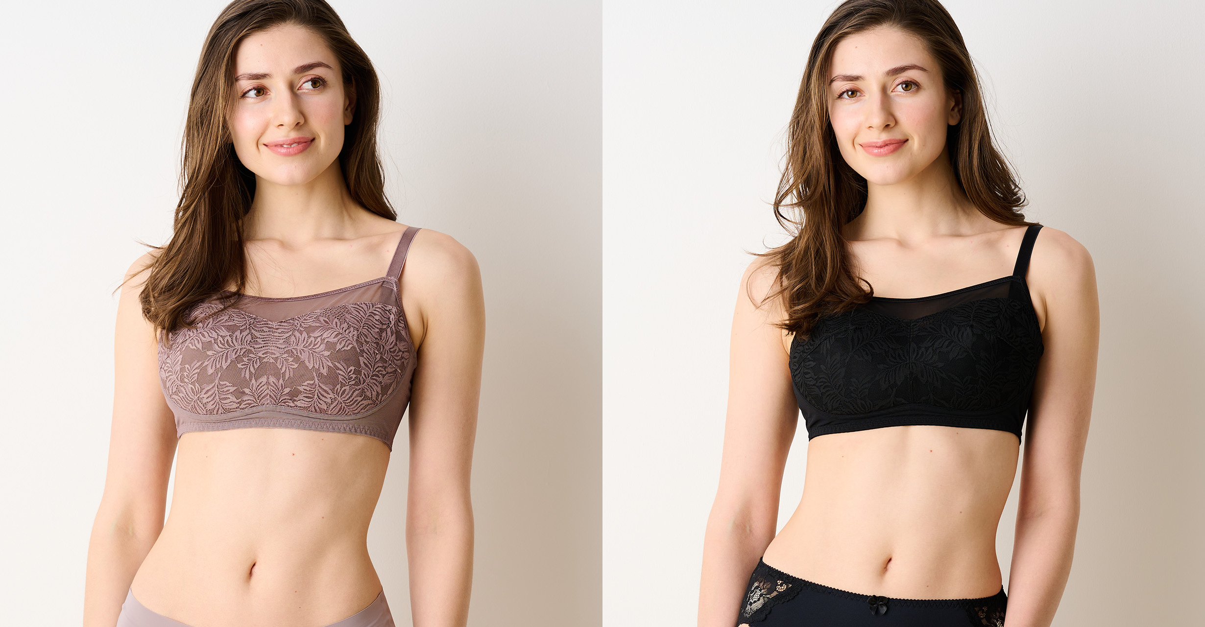 レースを伸縮性も高級感も兼ね備えたラッセルストレッチレースを使用しました。さらに胸元のシアーネットで大人っぽさを演出、可愛すぎず、普段使いもしやすいデザインに仕上げました。カラーはベーシックで使いやすい、ブラウンとブラック2色展開です。
