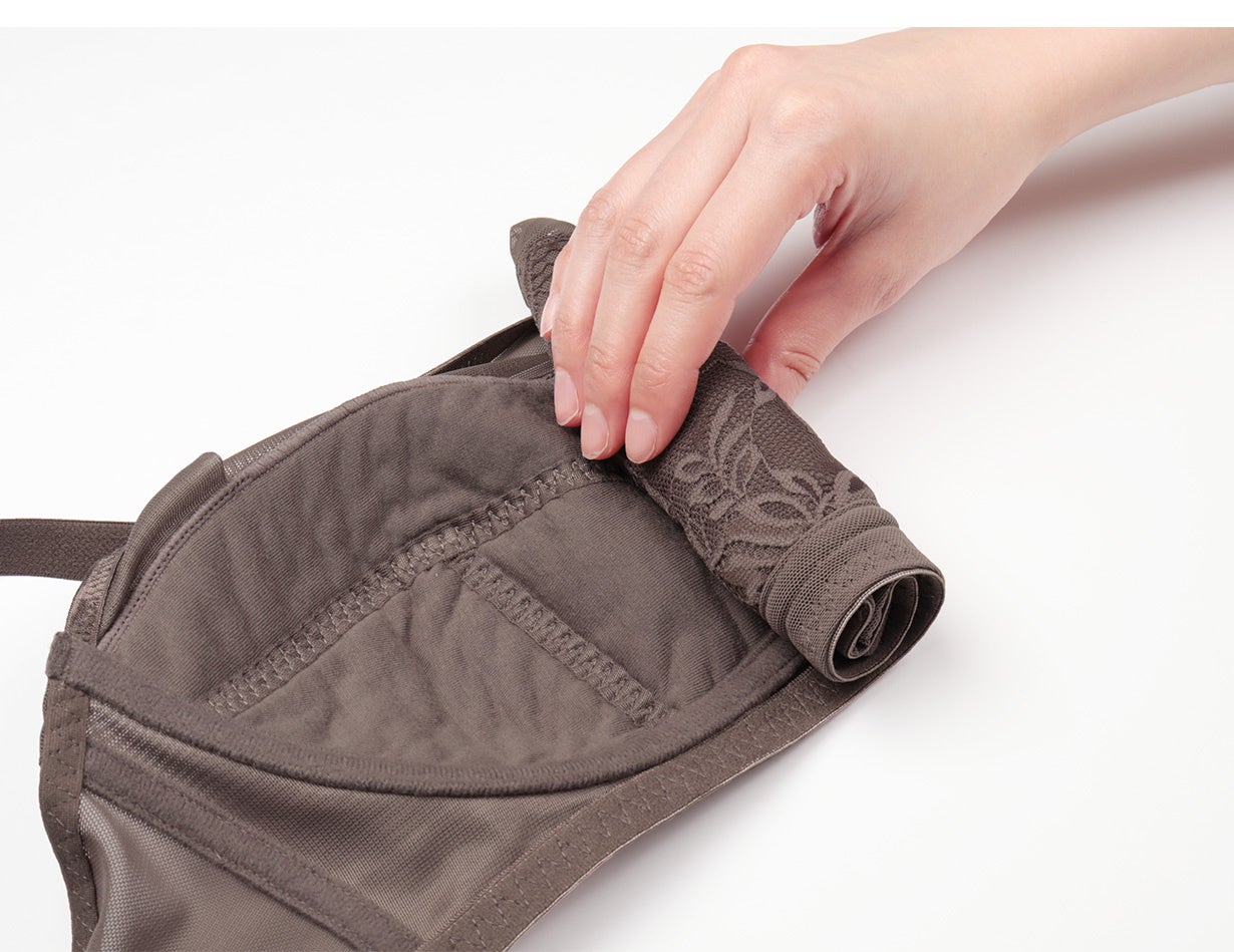 独自設計のカップ構造によりバストの横広がりと高さを抑えることで、コンパクトでありながら綺麗なバストシルエットを実現しました。さらしのように胸を押しつぶすのではなく、着用するだけで瞬時に綺麗なバストラインを作り出すよう設計されています。