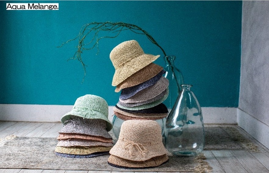 今シーズンの特徴として、新たに染め上げた新色が登場。その内2型は今人気のシャーベットカラーで9色展開いたします。春夏の帽子の素材としてペーパー素材は人気ですが、ナチュラルやベージュなどのスタンダードなカラーがメインカラーとして展開されていることが多いのが現状です。『Aqua Melange』は、春夏らしい華やかさのある9色展開となっているため、「外の人と同じように見える帽子はいや」「春夏らしい明るい色の帽子を被りたい」といった方にぴったりのカラー展開です。また、コットンの織物生地とアクアメランジェとの掛け合わせの型を増やし、これまで作ったことのない新たなテイストのキャップやボンネットなどを展開いたします。