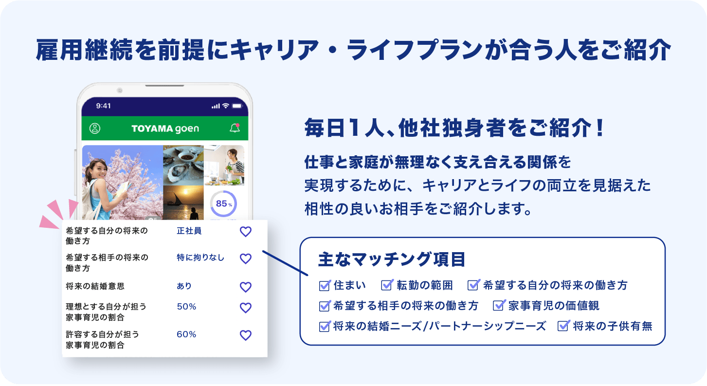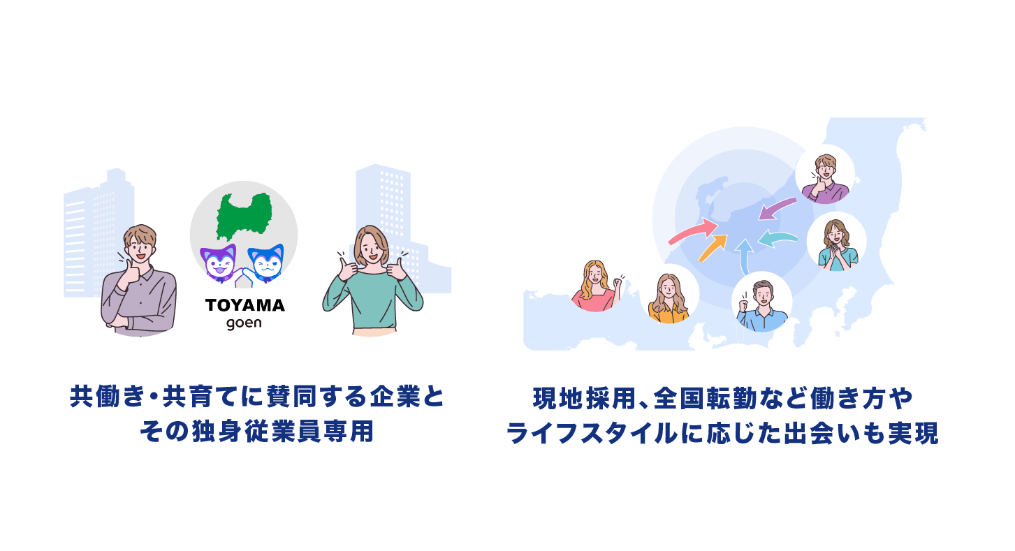 TOYAMA goenは富山県内の共働き・共育てを応援する企業等と所属する従業員専用だからこそ、今まで難しかった結婚後も仕事と家庭が両立できる出会いの機会の提供を実現します。