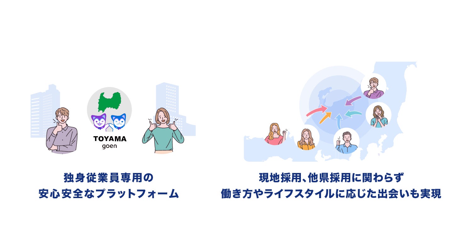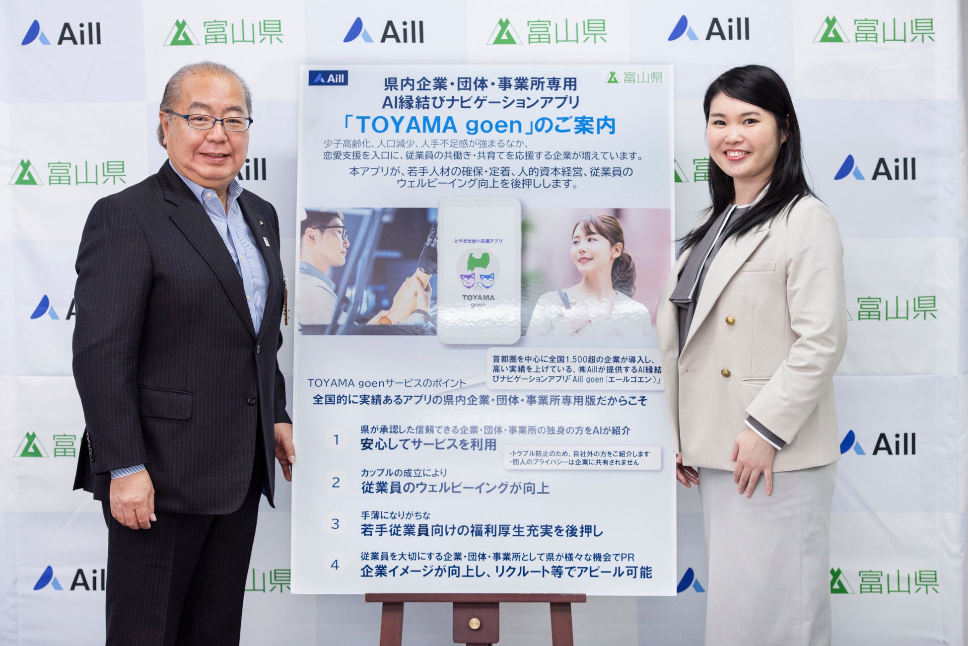株式会社Aill(エール)(代表取締役社長:豊嶋千奈、以下Aill)は、富山県(知事:新田八朗)と共同で、富山県が承認する共働き・共育てを応援する企業・団体・事業所の従業員専用となるAI縁結びアプリ「TOYAMA goen(トヤマ ゴエン)」の運用を開始します。本事業は、企業等専用AI縁結びアプリを県が導入する全国初の取り組みであり、出会いや結婚の希望を叶えるとともに、若手人材の確保・定着、人的資本経営、従業員のウェルビーイング向上を後押しすることを目的としています。
