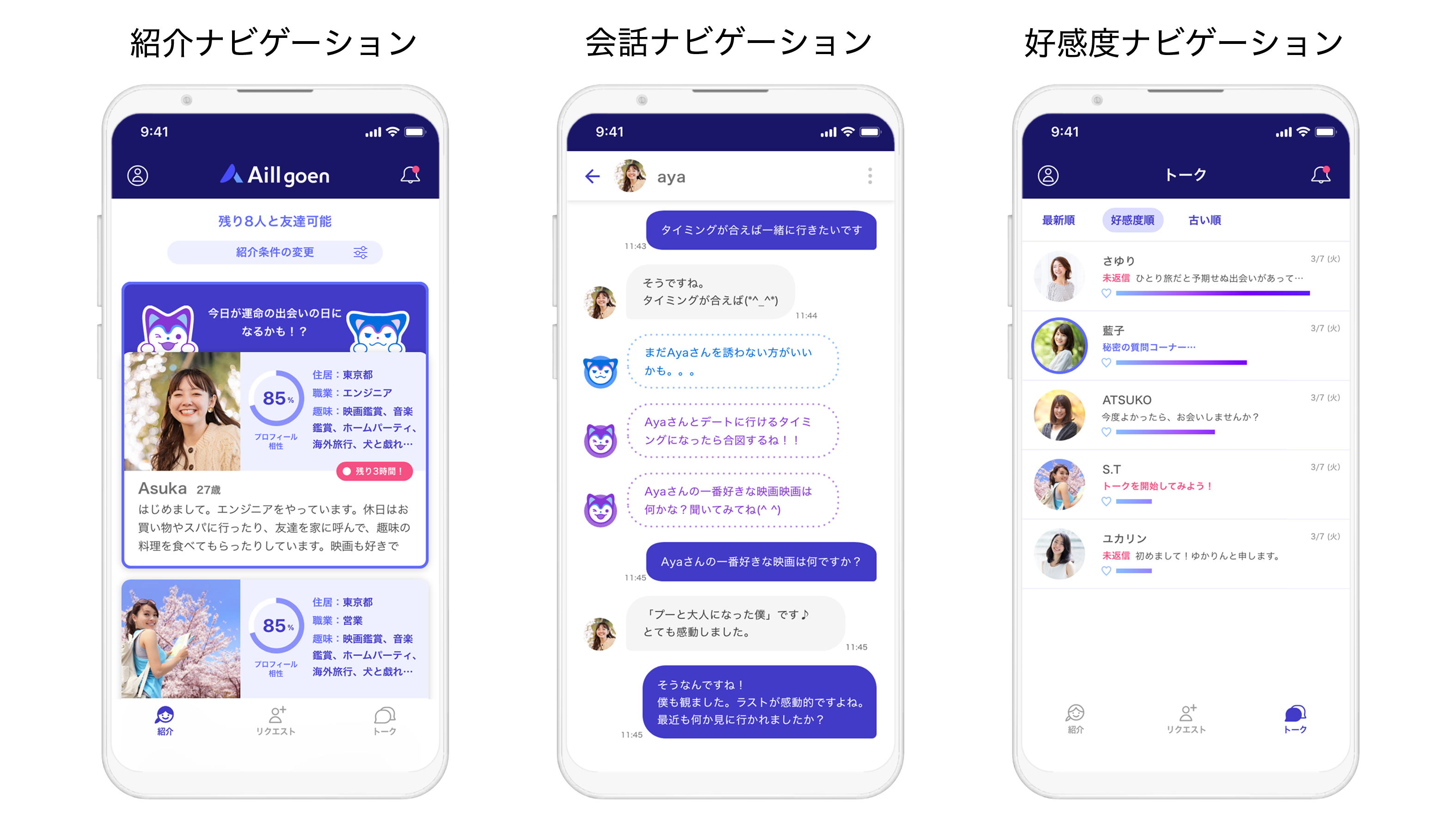 3つのAI機能により、社外の出会い〜お付き合いまでナビゲートします。