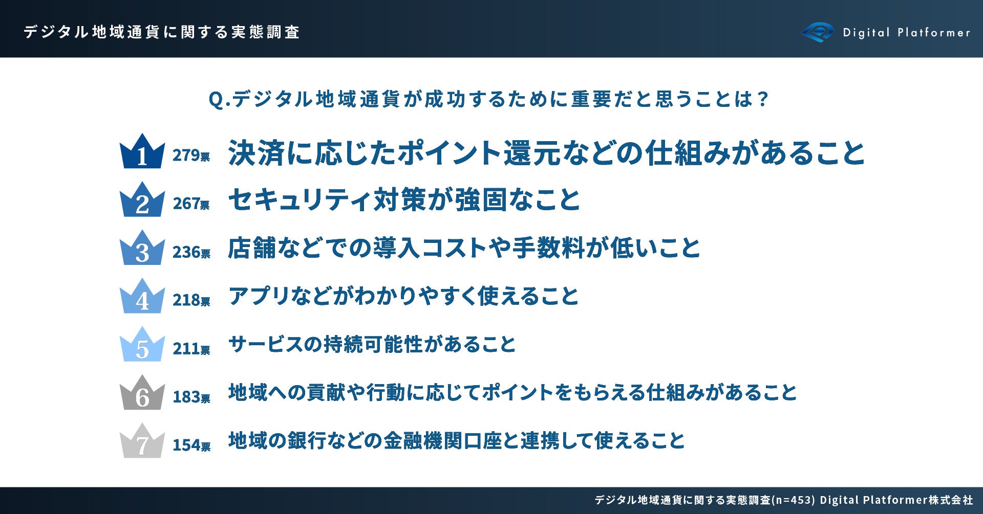 ・デジタル地域通貨が成功するために重要だと思うこと 第1位 決済に応じたポイント還元などの仕組み(61.6%)、第2位 強固なセキュリティ対策(58.9%)、第3位 店舗などでの導入コストや手数料の低さ (52.1%)