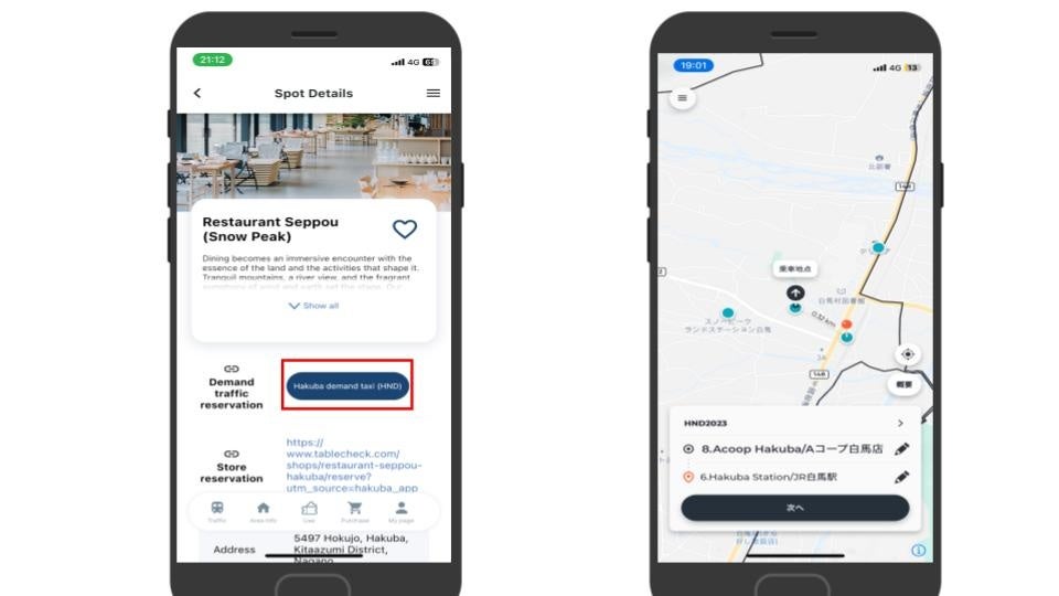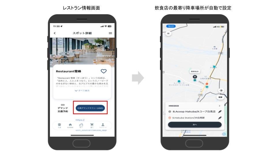 今回、新たな取り組みとして、SWATの運行アプリが、白馬村プラットフォームアプリ「HAKUBA Do」と連携し、レストラン予約と移動をシームレスに提供することで、移動先にある飲食店の課題(レストランの予約が取れない、宿泊施設のスタッフが予約対応に追われる等)の解決と、移動の利便性の更なる向上を目指します。「HAKUBA Do」から飲食店予約をすると「白馬ナイトデマンドタクシー(HND)」に遷移することができ、飲食店の最寄りの降車場所が自動で設定されます。これにより、白馬村内の飲食店の負荷軽減と飲食店利用者の利便性向上を実現します。