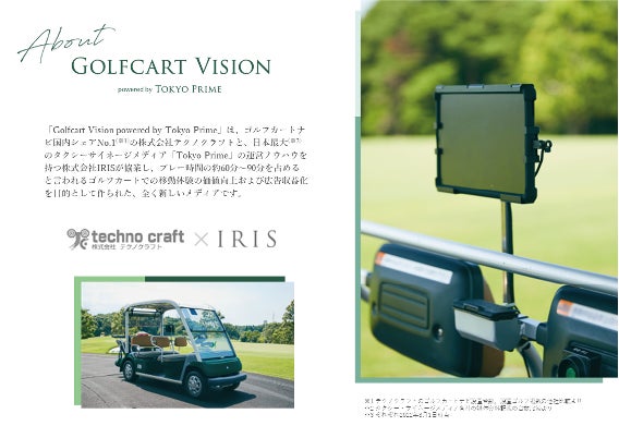 株式会社IRIS(本社:東京都港区、代表取締役:眞井 卓弥・宇木 大介、以下IRIS)は、ゴルフカートナビ国内シェアNo.1(※1)の株式会社テクノクラフト(本社:新潟県新潟市、代表取締役:栂坂 昌業、以下テクノクラフト)と協業し、ゴルフカートにサイネージを設置した新広告媒体「Golfcart Vision powered by Tokyo Prime」の販売を2022年9月5日より開始することをお知らせします。