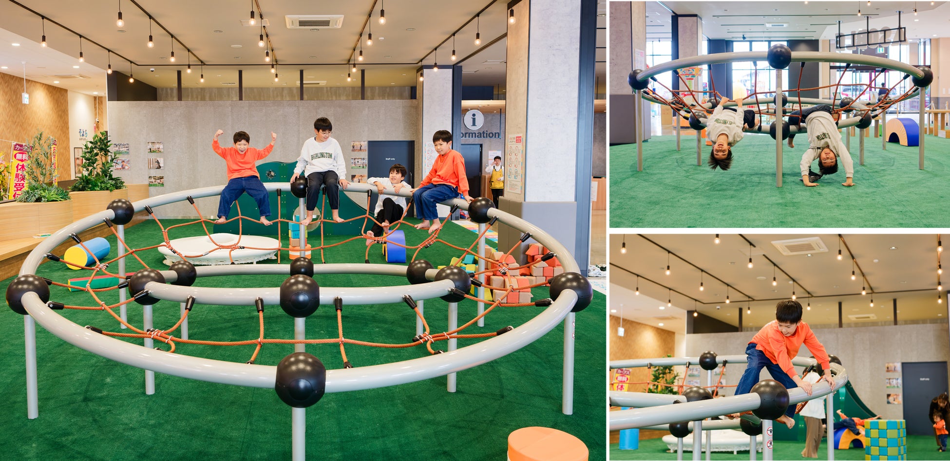 ASOBLEそよら三条須頃店に設置されるMIRAPPA(ミラッパ)は、今年10月にフィナーレを迎えた大阪・関西万博にて、株式会社ワイドレジャーが出展した「WIDE LEISURE EXPO 2025 遊んでい館?」内に設置された遊具。万博会期中、延べ52万人が来場した「遊んでい館?」のメインコンテンツとして、多くのこどもたちを楽しませました。特徴的な形をしており、木登りのように考えながら遊べるため、注意力や判断力を養える知的遊具です。