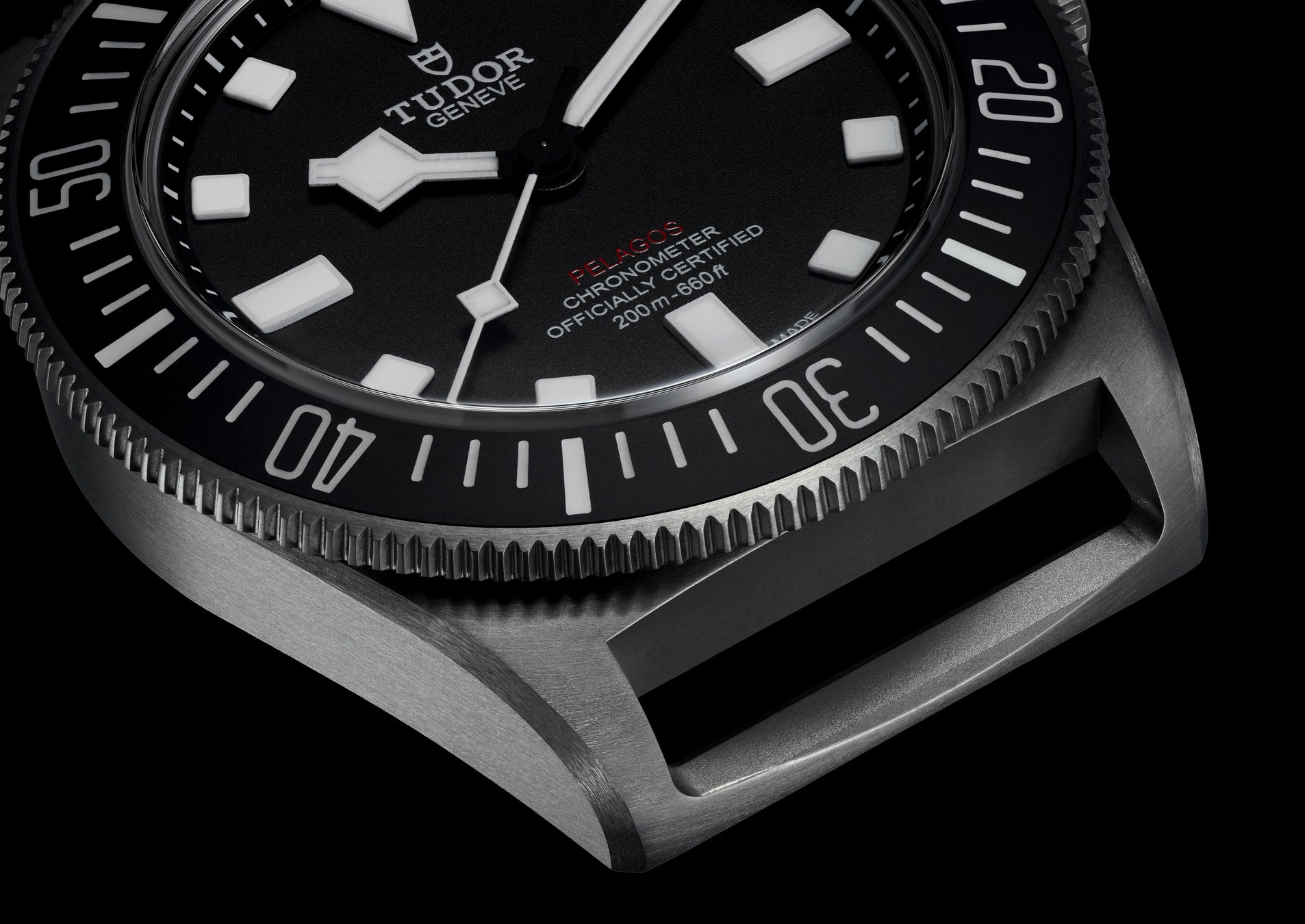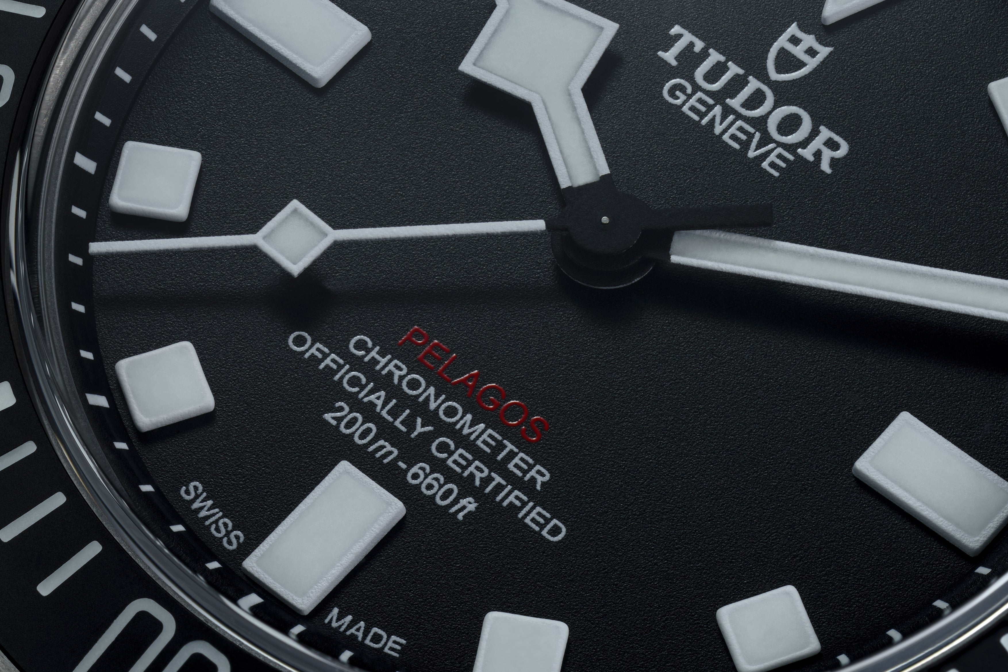 新しいペラゴス FXDの意匠は、60年代後半から80年代前半にかけてアメリカ海軍の隊員たちが着用していたチューダーのダイバーズウォッチを着想源としている。時計全体のカラーはブラック。そして暗闇の使用でも発光強度を最大化させるために1969年に導入された、スクエアが先端に付いた「スノーフレーク」針やスクエア型アワーマーカー。他にも、発光塗料を用いたサンドブラスト仕上げのセラミック製インサートと逆回転防止ベゼルを採用している。さらに、42mm径チタニウム製ケース全体にサテン仕上げを施し、そのマットな質感によって光の反射を制限している。