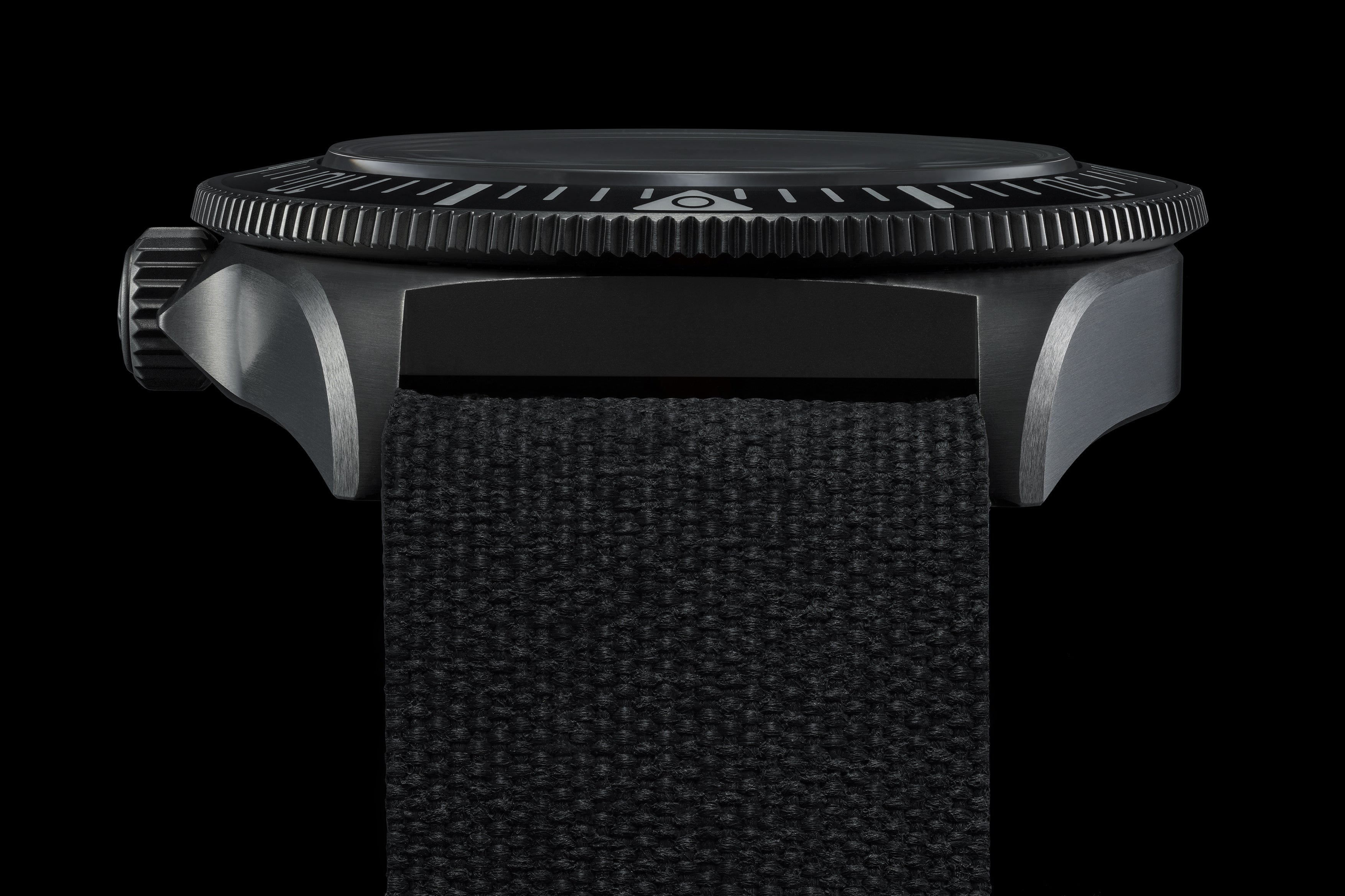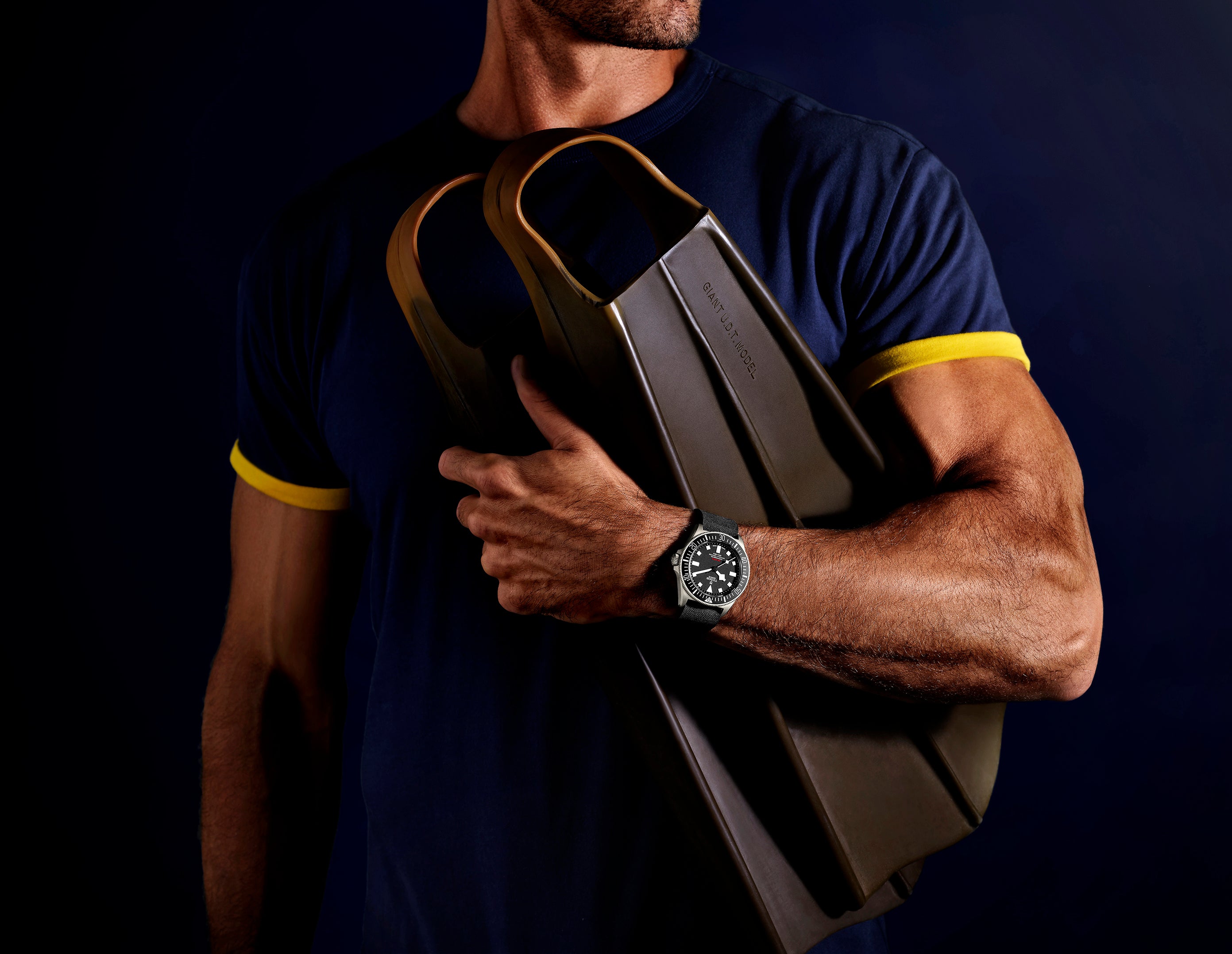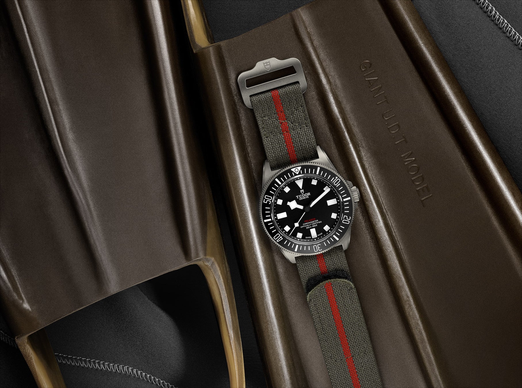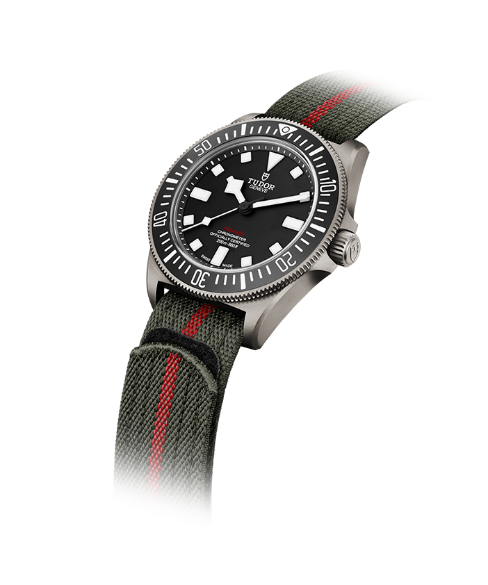 アメリカ海軍のダイバーは歴史的に、主にナイロン製のブラックまたはグリーンのファブリックストラップを装着してチューダー ウォッチを使用していた。ぺラゴス FXDに付属する2つのストラップは、ブレスレットよりもストラップを好むこのミリタリー的伝統から着想を得て、さらに工夫を加えたものだ。中央にレッドのラインが入った、セルフグリップ着脱システム付きのグリーン ファブリックストラップが初期設定となっている。さらに、テキスタイルモチーフがエンボスされたブラックのラバーストラップも付属する。