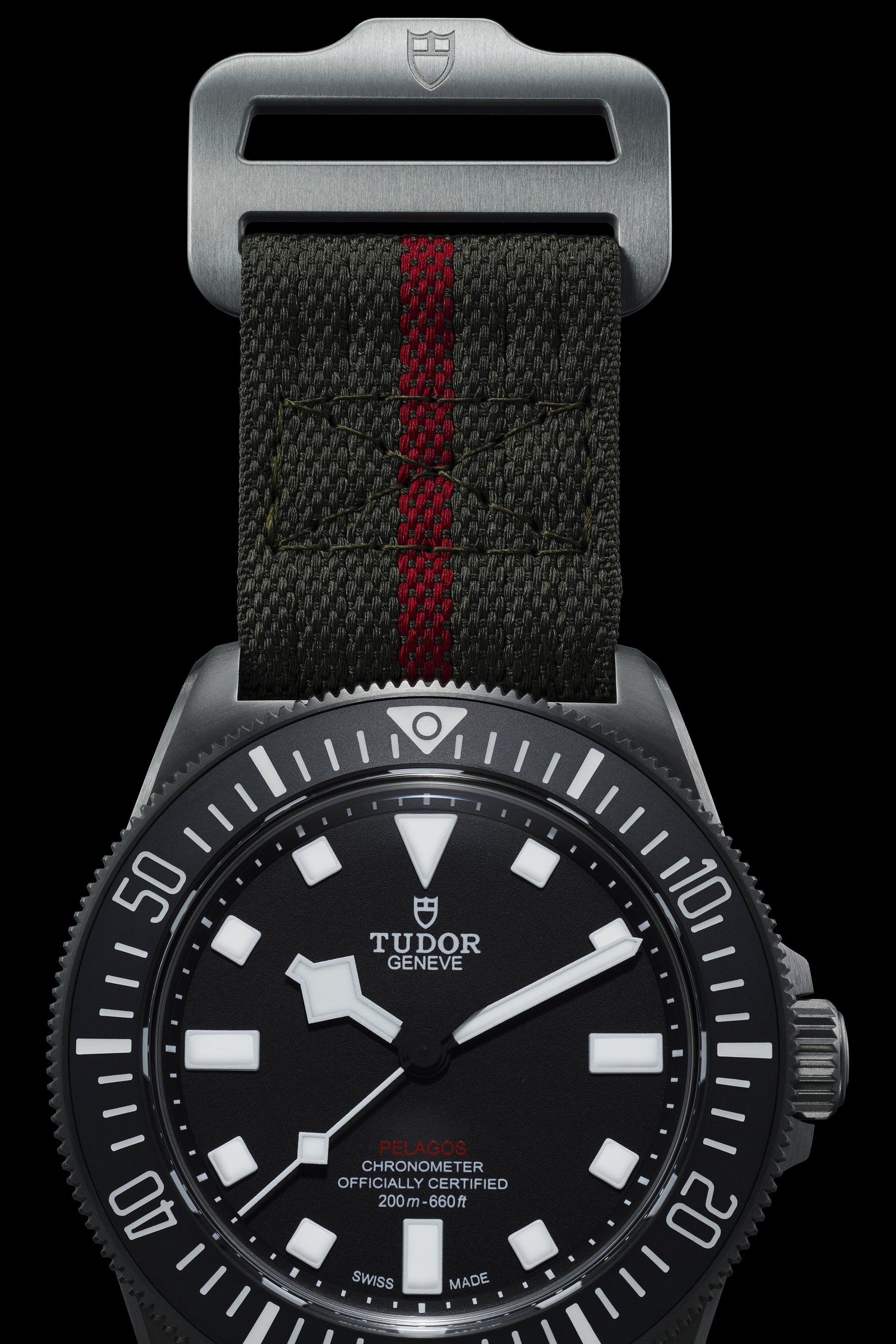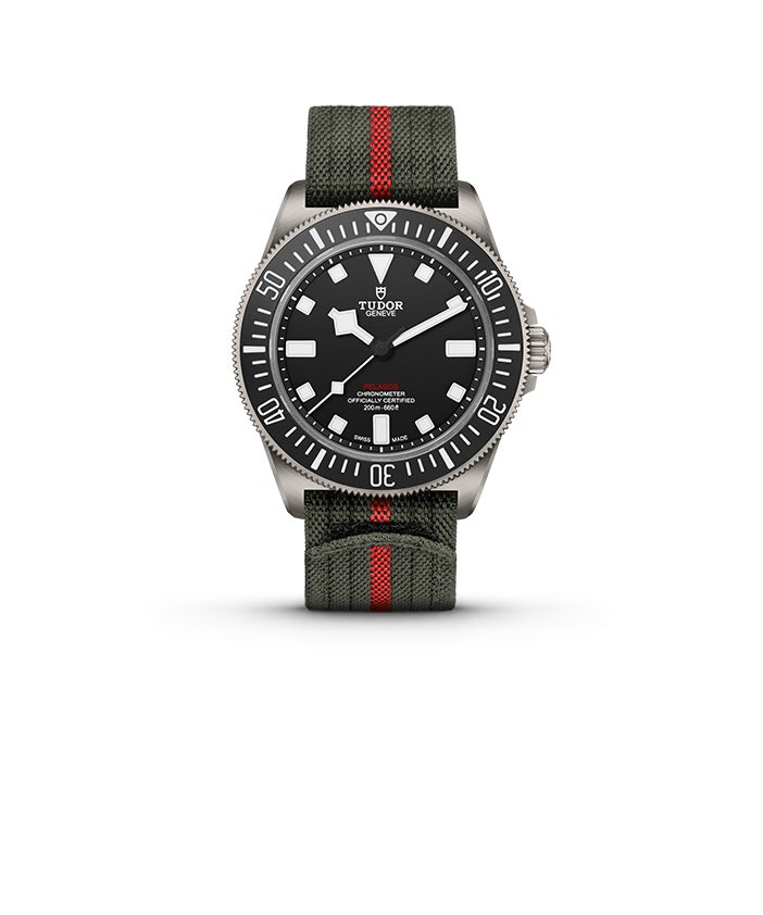 チューダーは2010年にいち早くファブリックストラップを採用して以来、常に先駆者であり続けている。フランスのサン・テティエンヌで150年以上家族経営を続けるジュリアン・フォール社によって、19世紀製の織機を用いて生み出されるファブリックストラップ。それは品質と快適さを両立する唯一無二の存在である。ペラゴス FXDのためにジュリアン・フォールとチューダーは、新しい構造のストラップを開発した。中央にレッドのラインが入ったフォレストグリーンのナイロン製織りリボン(幅22mm)にセルフグリップ着脱システムを組み合わせた新ストラップは、あらゆる手首に快適にフィットする。