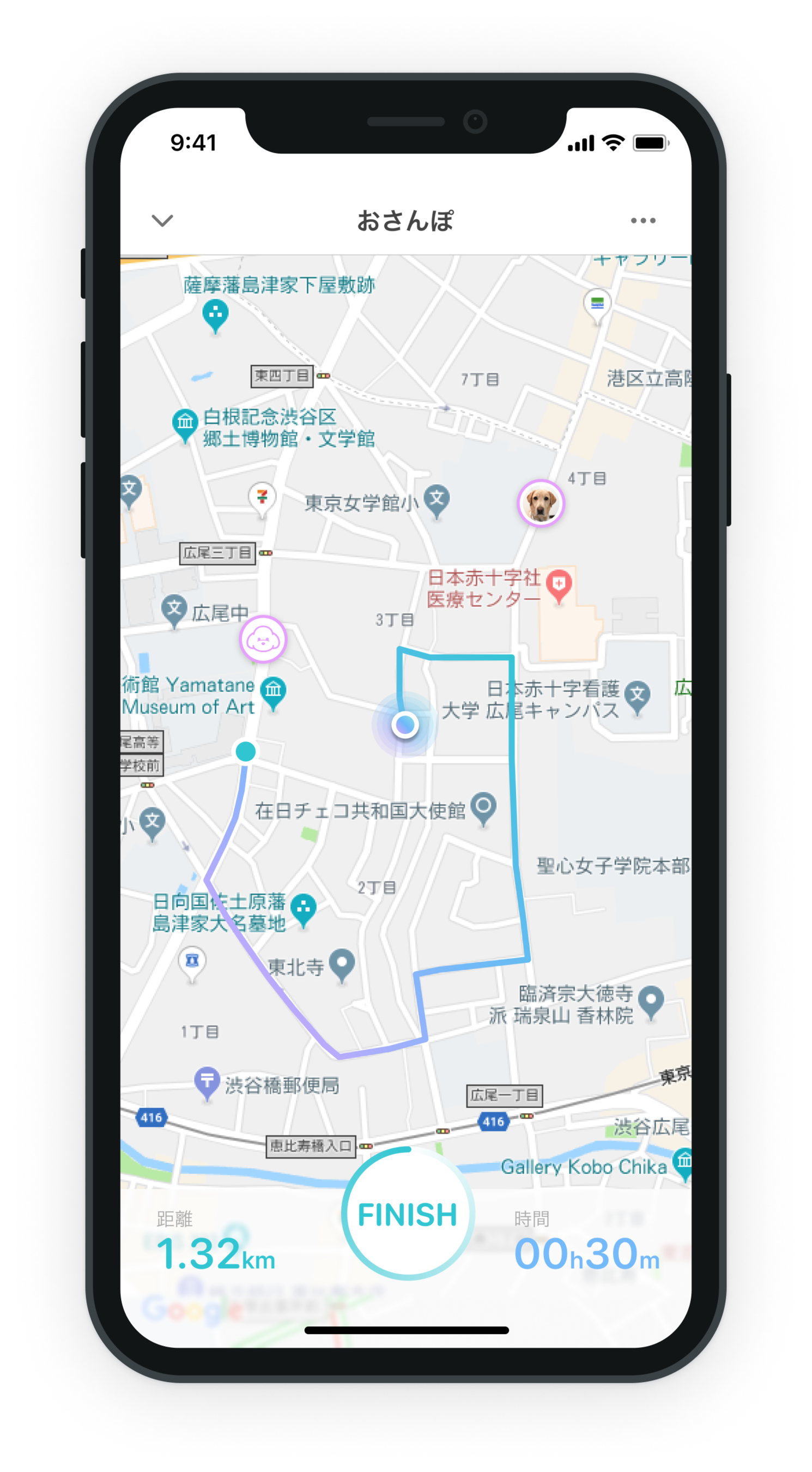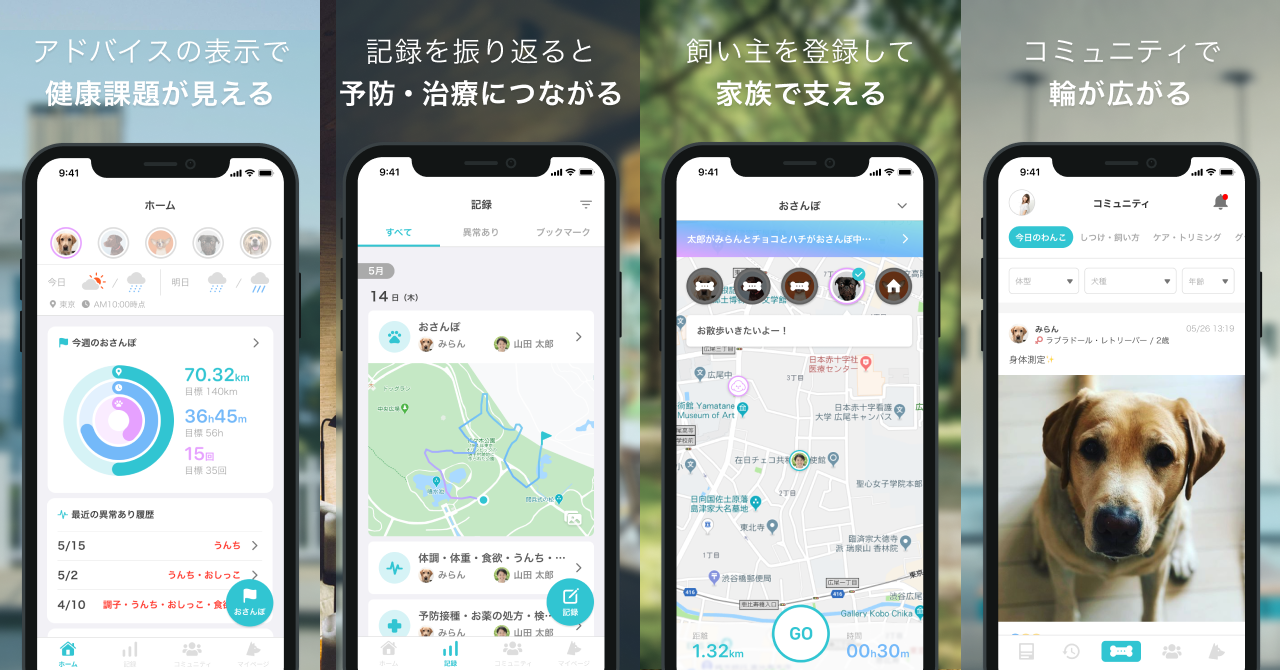 おさんぽ記録をアプリ内に残すことで日々のおさんぽがより楽しくなり、習慣化や適度な運動につながります。また、ヘルスケア記録は病気の予防や早期発見、適切なケアに役立ちます。