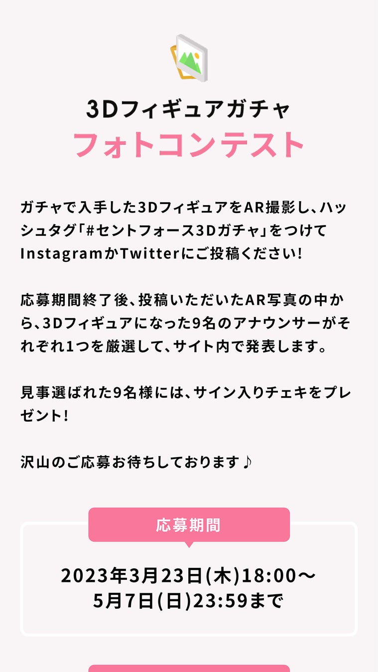 入手した3DフィギュアをAR撮影し、ハッシュタグ「#セントフォース3Dガチャ」をつけてTwitterあるいはInstagramに投稿することでフォトコンテスト企画に参加できます。ご投稿いただいたAR写真の中から、3Dフィギュアになった9名のアナウンサーがそれぞれ1つを厳選して、サイト内で発表します。見事選ばれた9名の方には、サイン入りチェキをプレゼントいたします!