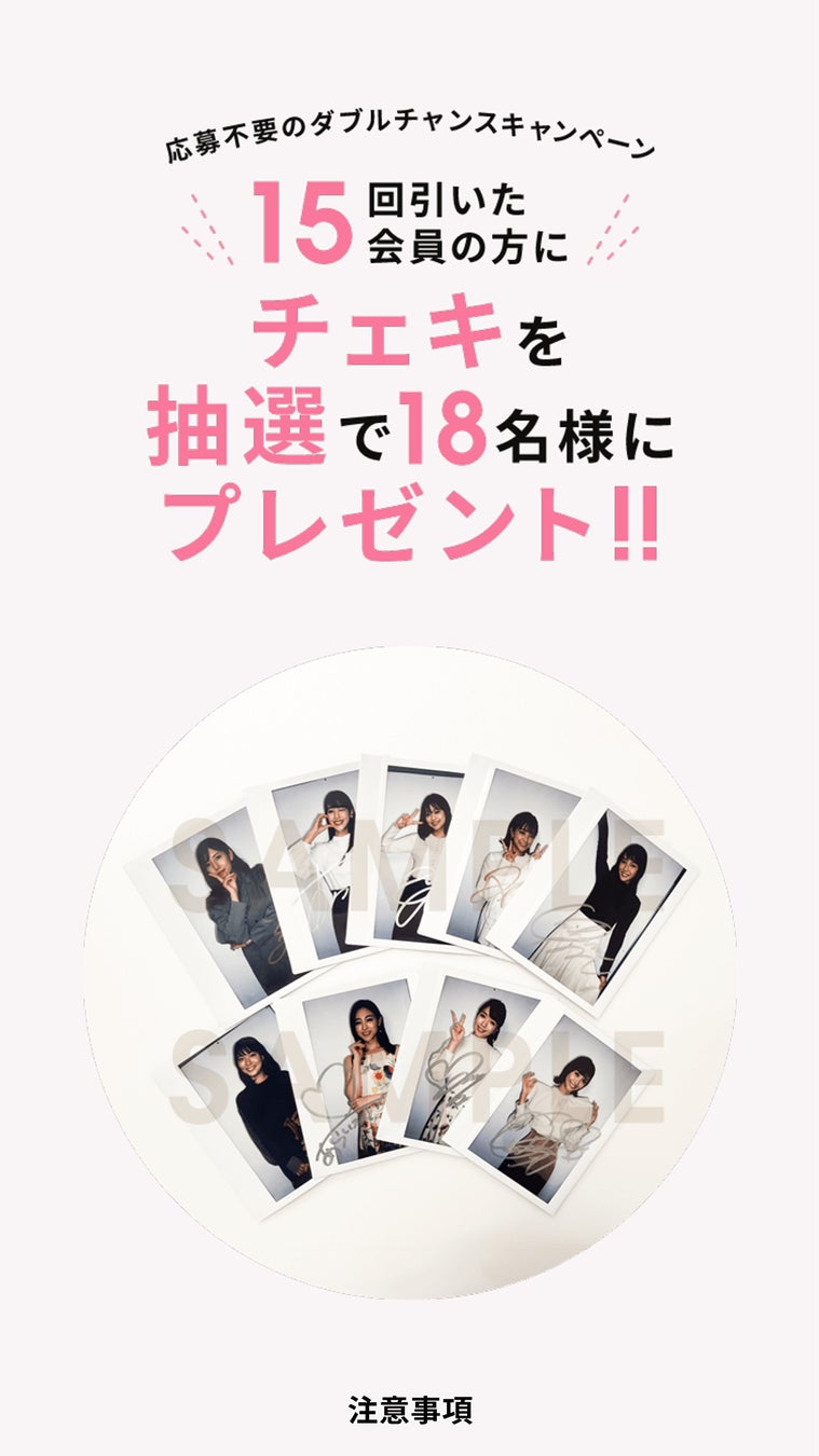 3Dフィギュアガチャを15回引いた方の中から抽選で18名様に、撮影時のサイン入りオフショットチェキをプレゼント。応募は不要で、15回以上引いた会員様は自動エントリーとなります。