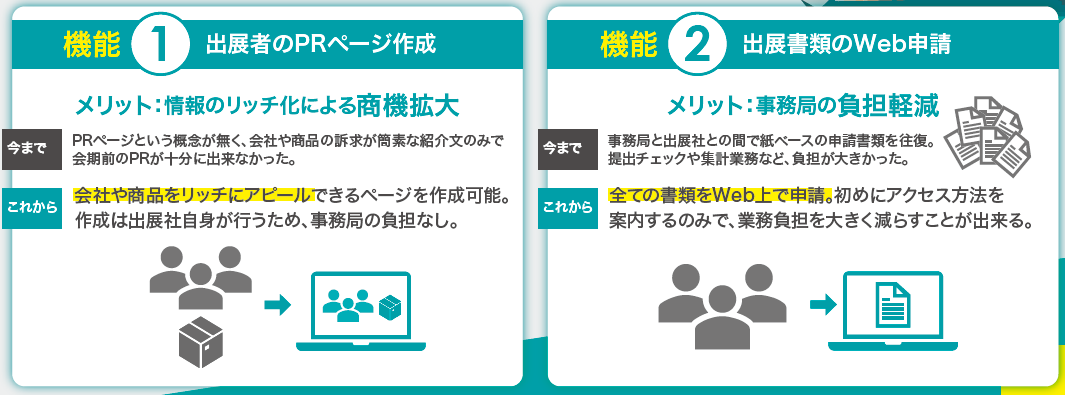 しかし今回のアップデートにより、申請書類のフォーム入力が可能となり、システム上に直接入力することで提出できるようになりました。書類の手書き入力の必要がなくなり出展者の作業工程が大幅に削減。主催者にとって「出展者満足度向上」という大きなメリットに繋がります。