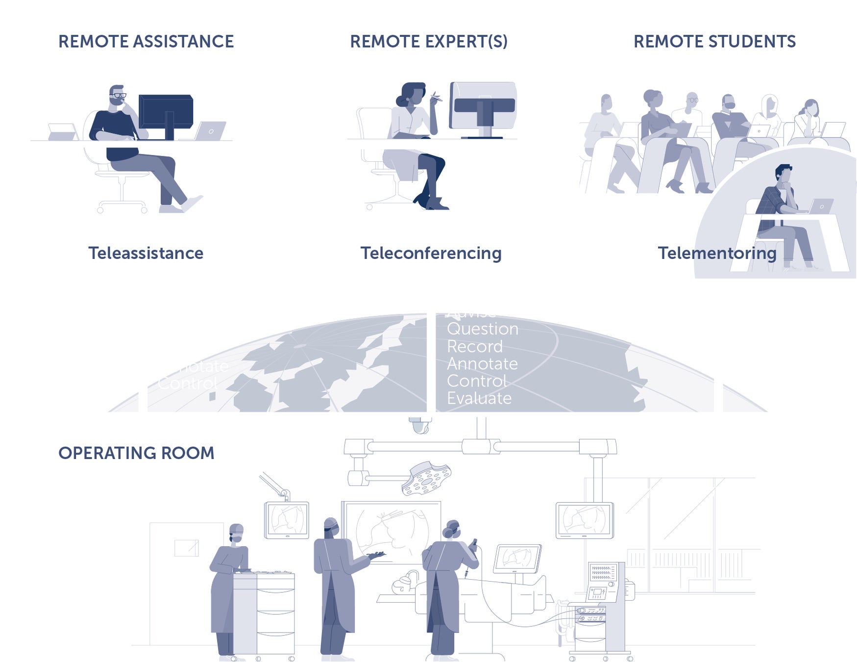 •リアルタイムに手術室の映像、音声を双方向で外部配信。エキスパート医師による技術支援や、医学生へリアルタイム手術画像を活用したバーチャル講義が可能に。